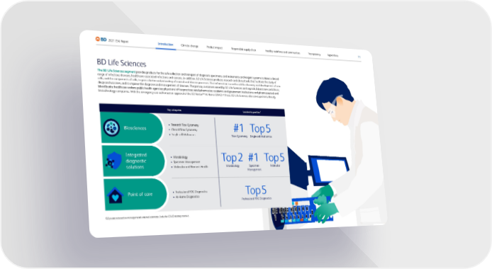 BD Life Sciences The BD Life Sciences segment provides products for the safe collection and transport of diagnostic specimens, and instruments and reagent systems to detect a broad range of infectious diseases, healthcare-associated infections and cancers. In addition, BD Life Sciences produces research and clinical tools that facilitate the study of cells, and the components of cells, to gain a better understanding of normal and disease processes. That information is used to aid the discovery and development of new drugs and vaccines, and to improve the diagnosis and management of diseases. The primary customers served by BD Life Sciences are hospitals, laboratories and clinics; blood banks; healthcare workers; public health agencies; physicians’ office practices; retail pharmacies; academic and government institutions; and pharmaceutical and biotechnology companies. With the emergency use authorization approval of the BD Veritor TM At Home COVID-19 test, BD Life Sciences also serves patients directly. Key categories Leadership position 2 Biosciences • R esearch Flow Cytometry • Clinic al Flow Cytometry • Single-c ell Multiomics Integrated diagnostic solutions • Micr obiology • Specimen Management • Molec ular and Women’s Health Point of care • Pr ofessional POC Diagnostics • A t-Home Diagnostics 2 BD position based on management’s internal estimates. Includes COVID testing revenue. #1 To p 5 Flow Cytometry Single-cell Multiomics To p 2 #1 To p 5 Microbiology Specimen Management Molecular To p 5 Professional POC Diagnostics 11 2021 ESG Report Appendices Transparency Healthy workforce and communities Responsible supply chain Product impact Climate change Introduction
