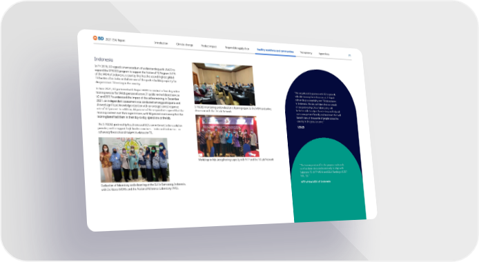 71 2021 ESG Report Transparency Responsible supply chain Product impact Climate change Introduction Healthy workforce and communities Appendices “We are pleased to partner with BD to provide valuable training for technicians at 21 liquid culture drug susceptibility test TB laboratories in Indonesia. We are confident that as a result of our partnership, these laboratories will be better able to adjust their testing and help roll out a new patient-friendly oral treatment that will benefit tens of thousands of people across the country in the years to come.” USAID “The training material fits the purpose and needs as it has been discussed extensively to align with Substansi TB (NTP-MOH) and BBLK Surabaya (CDST NRL TB).” NTP of the MOH of Indonesia Indonesia In FY 2019, BD signed a memorandum of understanding with USAID to expand the STRIDES program to support the National TB Program (NTP) of the MOH of Indonesia, a country that has the second highest global TB burden after India and where one of the goals is building capacity for drug-resistant TB testing in the country. In June 2021, BD partnered with Project HOPE to conduct a four-day online training session for 69 lab personnel across 21 public sector laboratories on LC and DST. To understand the impact of the online training, in December 2021, an independent assessment was conducted among participants and showed significant knowledge retention with an average correct response rate of 87 percent. In addition, 88 percent of the respondents agreed that the training content met their expectations, with 98 percent mentioning that the training benefited them in their day-to-day operations at the lab. The STRIDES partnership has showcased BD’s commitment to be a solution provider, and to support high-burden countries—India and Indonesia—in achieving their national targets to eliminate TB. Evaluation of laboratory and e-learning at the BLK in Semarang, Indonesia, with Dr. Retno (MOH), and the National Reference Laboratory (NRL). STRIDES monitoring and evaluation e-learning report to the MOH and online discussion with the TB Lab Network Workshop on lab strengthening capacity with NTP and the TB Lab Network