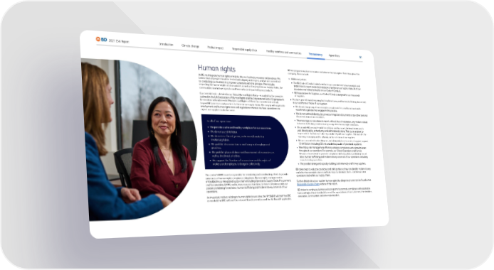 81 2021 ESG Report Healthy workforce and communities Appendices Responsible supply chain Product impact Climate change Introduction Transparency Human rights At BD, we integrate human rights principles into our business processes and practices. We believe that all people should be treated with dignity and respect, and we are committed to conducting our business in a manner consistent with this principle. This includes respecting the human rights of all associates, as well as the people in our supply chains, the communities in which we operate and those who are impacted by our products. Our commitment—detailed in our Global Human Rights Policy—is guided by the principles outlined in the UN Declaration of Human Rights and the International Labor Organization’s Declaration on Fundamental Principles and Rights at Work. Our commitment extends beyond BD processes and practices to those in our supply chains. We comply with applicable employment and human rights laws and regulations wherever we have operations; we expect our suppliers to do the same. In all of our operations: • W e provide a safe and healthy workplace for our associates. • W e do not use child labor. • W e do not use forced, prison, indentured, bonded or involuntary labor. • W e prohibit discrimination in our hiring and employment practices. • W e prohibit physical abuse and harassment of associates, as well as the threat of either. • W e support the freedom of association and the rights of workers and employers to bargain collectively. The central S&EHS team is responsible for monitoring and coordinating efforts to provide awareness of human rights compliance obligations. Human rights management is embedded in our integrated supply chain (including Operations, Supply Chain, Procurement and Sustainability & EHS) and human resources functions, to foster compliance with our policies prohibiting forced labor, human trafficking and modern slavery across all of our operations. As important matters relating to human rights issues arise, the VP S&EHS will brief the ERC as needed; the ERC will brief the relevant Board committee and the full Board if applicable. BD has programs in place to monitor and advance human rights efforts throughout the company. These include: • A dditional policies • T he BD Code of Conduct, which reinforces our commitment to human rights and details how to report suspected violations anywhere in our supply chain. All of our associates are trained annually on our Code of Conduct. • BD Expect ations for Suppliers, our Code of Conduct designed for our thousands of suppliers. • Pr actices geared toward ensuring that modern slavery and human trafficking do not exist in our workforce or those of our suppliers • W e do not charge any of our associates recruitment fees, and do not work with recruitment agencies that engage in this practice. • W e do not withhold identity documents, immigration documents or any other personal documentation of our associates. • W e encourage our associates to report, without fear of retaliation, any matters related to human trafficking, modern slavery or any other human rights violations. • W e provide BD associates with forced labor and human trafficking training each year, developed by a third party and administered online. This course is taken by any associate that interacts directly or indirectly with our suppliers. This includes the sourcing, managing and/or advising on the selection of our suppliers. • W e are committed to due diligence, including initial assessments of suppliers against 12 risk factors (including ESG risk and desktop audits of prioritized suppliers). • W e employ risk management efforts to enhance compliance with related policies throughout our operations. For example, our Global Operations and Human Resources teams work to promote compliance with our policies prohibiting forced labor, human trafficking and modern slavery across all of our operations, including manufacturing operations. • W e provide training and capacity-building, both internally and for key suppliers. BD takes steps to educate associates and third parties so they can identify modern slavery and other human rights abuses and take steps to eliminate them—both in our own operations and within our supply chain. Further details about our supplier human rights due diligence process can be found in the Responsible Supply Chain section of this report. BD strives to continuously improve its programs to promote compliance with applicable laws and high ethical standards to meet the expectations of our customers, shareholders, associates, communities and other stakeholders.