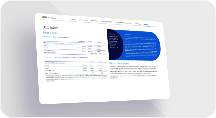 95 2021 ESG Report Transparency Appendices Responsible supply chain Product impact Climate change Introduction Healthy workforce and communities 2030+ goal: Reduce Scope 1 and 2 emissions by 46% by 2030 (from 2019 baseline, absolute) Carbon-neutral across direct operations by 2040 Current status: Decreased by 7% (market-based, excluding unbundled REC purchase) in FY 2019, increased by 23% (market-based, including unbundled REC purchase) in FY 2019, In previous years, we have purchased additional unbundled Renewable Energy Credits (RECs) to offset greenhouse gas (GHG) emissions at our U.S. facilities. However, due to the significant increase in the market price for RECs in FY 2020, we purchased and retired nearly 150,000 metric tonnes CO 2 e of carbon offsets. (These offsets are not reflected in the data provided above). In FY 2021, we chose to divert funds set aside for the purchase of RECs to activities to establish baseline emissions for our significant sources of Scope 3 emissions. Over the coming years we will continue to develop our strategy for achieving our stated commitments to carbon neutrality. Data tables Scope 1 and 2 GHG emissions — Scope 1 and 2 (market-based*) FY 2019 baseline FY 2020 FY 2021 Metric tonnes CO 2 e, absolute emissions Scope 1* 147,434 144,005 152,299 Scope 2 254,961 346,603 342,202 Total Scope 1 and 2 402,395 490,609 494,501 reduction from baseline 22% (increase) 23% (increase) GHG emissions – Scope 1 and 2 (market-based) excluding FY 2019 unbundled RECs FY 2019 baseline FY 2020 FY 2021 Metric tonnes CO 2 e, absolute emissions Scope 1 147,434 144,005 152,299 Scope 2 382,377 346,603 342,202 Total Scope 1 and 2 529,811 490,609 494,501 reduction from baseline 7% 7% * Mark et-based (MB): quantifies Scope 2 GHG emissions based on GHG emissions emitted by the generators from which the reporter contractually purchases electricity bundled with contractual instruments, or contractual instruments on their own (e.g., utility-specific emission factors, renewable energy certificates). ** Emissions r elated to our sales fleet were previously included in Scope 3 Category 6; it is now included in Scope 1. Data for FY 2019 and FY 2020 has been restated accordingly. Method of calculation Data represents Scope 1 (direct) and Scope 2 (indirect from electricity) energy sources. BD has used emission factors that are temporally, geographically and technologically accurate for each site and source within its operational boundary as specified by the WRI/WBCSD GHG Protocol. This includes updating electric power emission factors to reflect changes in the grid mix for areas in which BD operates. As many utilities have ceased publishing emission factors, we have used regional emission factors and restated across all years to ensure consistency. In general, historical emission factors remain consistent with the publication that was most recent at the time of original reporting.
