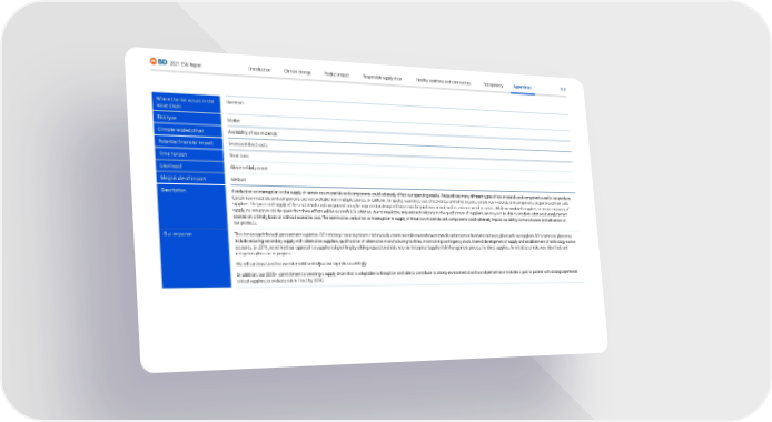 117 2021 ESG Report Transparency Appendices Responsible supply chain Product impact Climate change Introduction Healthy workforce and communities Where the risk occurs in the value chain Upstream Risk type Market Climate-related driver Availability of raw materials Potential financial impact Increased direct costs Time horizon Short-term Likelihood About as likely as not Magnitude of impact Medium Description A reduction or interruption in the supply of certain raw materials and components could adversely affect our operating results. We purchase many different types of raw materials and components used in our products. Certain raw materials and components are not available from multiple sources. In addition, for quality assurance, cost effectiveness and other reasons, certain raw materials and components are purchased from sole suppliers. The price and supply of these materials and components may be impacted or disrupted for reasons beyond our control, such as extreme weather events. While we work with suppliers to ensure continuity of supply, no assurance can be given that these efforts will be successful. In addition, due to regulatory requirements relating to the qualification of suppliers, we may not be able to establish additional or replacement sources on a timely basis or without excessive cost. The termination, reduction or interruption in supply of these raw materials and components could adversely impact our ability to manufacture and sell certain of our products. Our response This is managed through procurement expertise. BD’s strategic sourcing teams continuously assess our sole-sourced raw materials and maintain business continuity plans with our suppliers. BD’s continuity plans may include securing secondary supply with alternative suppliers, qualification of alternative manufacturing facilities, maintaining contingency stock, internal development of supply and establishment of technology escrow accounts. In 2016, we refined our approach to supplier risk profiling by adding reputational risks into our Enterprise Supplier Risk Management process, for direct suppliers. An initial set of risks were identified, and mitigation plans are in progress. We will continue to refine our risk model and adjust our top risks accordingly. In addition, our 2030+ commitment to creating a supply chain that is adaptable to disruption and able to contribute to strong environmental and social performance includes a goal to partner with strategic/preferred/ critical suppliers to evaluate risk in Tier 2 by 2030.