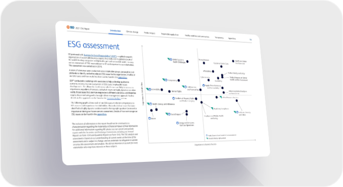 ESG assessment BD partnered with Business for Social Responsibility™ (BSR™) —a global nonprofit organization of sustainable business experts that works with its global network of the world’s leading companies to help build a just and sustainable world—to carry out an assessment of ESG issues relevant to BD and important to our stakeholders. This assessment was carried out in 2019. A series of interviews were conducted across stakeholder groups, geographies and job levels to identify and refine relevant ESG issues for the organization. A full list of our ESG issues and how we define them can be found in the appendices . BSR™ conducted a workshop with associates to help us develop qualitative scenarios to stress-test our assessment of ESG issues for plausible future developments. This allowed us to determine which issues are likely to increase in importance, regardless of scenario, and which issues are highly dynamic—in other words, those issues that are more responsive to different scenarios—and therefore require close monitoring and a foresight-driven management approach. Further details on this approach can be found in the Scenario Analysis section. The following graphic shows each of our ESG issues in relation to importance to BD’s success and importance to stakeholders. Also indicated are issues that were identified as highly dynamic and/or moved to the top-right quadrant (increased in importance) during our future scenario assessment. Details of how we manage our ESG issues can be found in the appendices . The inclusion of information in this report should not be construed as a characterization regarding the materiality or financial impact of that information. For additional information regarding BD, please see our current and periodic reports with the Securities and Exchange Commission, including our Annual Reports on Form 10-K and Quarterly Reports on Form 10-Q. The ESG analysis and assessment is based on our understanding of current events at the time of the assessment and is subject to change, and we undertake no obligation to update or revise this assessment and analysis. We did not interview or account for every stakeholder who may have interests in these subjects. Pricing Pressure Customer-Centric Care Affordability Transparency Healthcare Market Transformation Human Rights Availability Product Quality and Safety Cybersecurity Accessibility Intellectual Property Rights and Product Integrity Supply Chain Continuity and Sustainability Product Impacts on Human Health and the Environment Social Impact Regulatory Compliance Advancing Medical Analytics and Automation Water Energy and Emissions from our Operations Inclusion, Diversity and Talent Importance to Stakeholders Importance to Business Success Moved to the top right quadrant Highly Dynamic Issue (moved in 3 or more scenarios) Global Systemic Health Challenges Collaboration and Partnerships Ethical Business Practices Health Literacy and Adherence Employee and Worker Health and Safety 18 2021 ESG Report Appendices Transparency Healthy workforce and communities Responsible supply chain Product impact Climate change Introduction