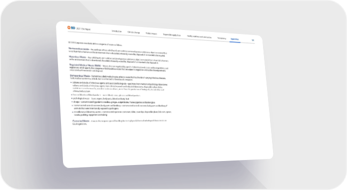 101 2021 ESG Report Transparency Appendices Responsible supply chain Product impact Climate change Introduction Healthy workforce and communities BD EHS Corporate standards define categories of waste as follows. Nonhazardous waste – Any garbage, refuse, solid, liquid, semi-solid or contained gaseous substance, object or material that is not harmful to humans or the environment that is discarded, inherently waste-like, disposed of or intended to be recycled. Hazardous Waste – Any solid, liquid, semi-solid or contained gaseous substance, object or material that is harmful to humans or the environment that is abandoned, discarded, inherently waste-like, disposed of or intended to be disposed of. Regulated Medical Waste (RMW) – Wastes that are regulated by specific federal (national), state and local guidelines and regulations which specify the categories of biohazardous waste that are subject to regulation and outline the requirements associated with treatment and disposal. Biohazardous Waste – Sometimes called medical waste, refers to waste that has the risk of carrying infectious diseases. Biohazardous waste may include, but is not limited to these broad categories: • c ultures and stocks of infectious agents and associated biologicals – specimens from medical and pathology laboratories; cultures and stocks of infectious agents from clinical, research and industrial laboratories; disposable culture dishes and devices used to transfer, inoculate and mix cultures; waste from the production of biologicals; discarded live and attenuated vaccines • human blood and blood pr oducts – waste blood, serum, plasma and blood products • pathologic al waste – tissue, organs, body parts, blood and body fluid • sharps – c ontaminated hypodermic needles, syringes, scalpel blades, Pasteur pipettes and broken glass • c ontaminated animal carcasses, body parts and bedding – contaminated animal carcasses, body parts and bedding of animals that were intentionally exposed to pathogens • misc ellaneous laboratory waste – contaminated specimen containers, slides, cover slips, disposable gloves, lab coats, aprons, towels, padding, equipment and tubing Controlled Waste – A waste that requires special handling due to its physical, chemical or biological characteristics or local regulations.