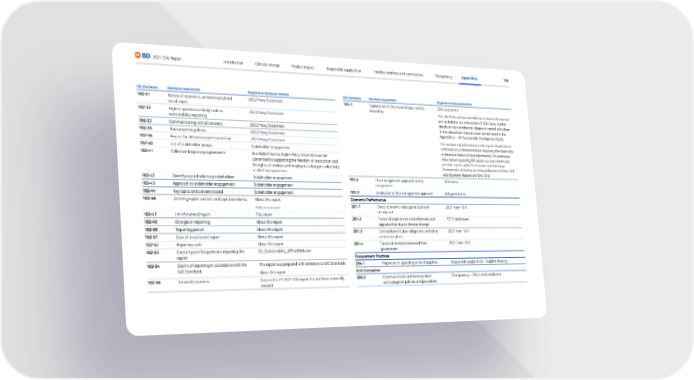 106 2021 ESG Report Transparency Appendices Responsible supply chain Product impact Climate change Introduction Healthy workforce and communities GRI Disclosure Disclosure requirement Response or disclosure location 102-31 Review of economic, environmental and social topics 2022 Proxy Statement 102-32 Highest governance body’s role in sustainability reporting 2022 Proxy Statement 102-33 Communicating critical concerns 2022 Proxy Statement 102-35 Remuneration policies 2022 Proxy Statement 102-36 Process for determining remuneration 2022 Proxy Statement 102-40 List of stakeholder groups Stakeholder engagement 102-41 Collective bargaining agreements Our Global Human Rights Policy states that we are committed to supporting the freedom of association and the rights of workers and employers to bargain collectively in all of our operations. 102-42 Identifying and selecting stakeholders Stakeholder engagement 102-43 Approach to stakeholder engagement Stakeholder engagement 102-44 Key topics and concerns raised Stakeholder engagement 102-46 Defining report content and topic boundaries About this report ESG assessment 102-47 List of material topics ESG issues 102-49 Changes in reporting About this report 102-50 Reporting period About this report 102-51 Date of most recent report About this report 102-52 Reporting cycle About this report 102-53 Contact point for questions regarding the report [email protected] 102-54 Claims of reporting in accordance with the GRI Standards This report was prepared with reference to GRI Standards. About this report 102-56 External assurance Data in this FY 2021 ESG report has not been externally assured. GRI Disclosure Disclosure requirement Response or disclosure location 103-1 Explanation of the material topic and its boundary ESG assessment The UN SDGs and our contribution to their achievement was included in our assessment of ESG issues. Further details on our contribution, degree of control and where in the value chain impacts occur can be found in the Appendices – UN Sustainable Development Goals. The inclusion of information in this report should not be construed as a characterization regarding the materiality or financial impact of that information. For additional information regarding BD, please see our current and periodic reports with the Securities and Exchange Commission, including our Annual Reports on Form 10-K and Quarterly Reports on Form 10-Q. 103-2 The management approach and its components ESG issues 103-3 Evaluation of the management approach ESG governance Economic Performance 201-1 Direct economic value generated and distributed 2021 Form 10-K 201-2 Financial implications and other risks and opportunities due to climate change TCFD disclosures 201-3 Defined benefit plan obligations and other retirement plans 2021 Form 10-K 201-4 Financial assistance received from government 2021 Form 10-K Procurement Practices 204-1 Proportion of spending on local suppliers Responsible supply chain – Supplier diversity Anti-Corruption 205-2 Communication and training about anti-corruption policies and procedures Transparency – Ethics and compliance