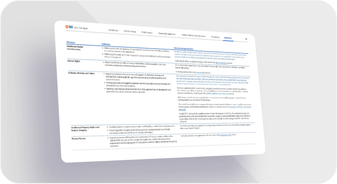 90 2021 ESG Report Transparency Appendices Responsible supply chain Product impact Climate change Introduction Healthy workforce and communities ESG issue Definition How we manage this issue Healthcare Market Transformation • A ddressing the risks and opportunities posed by the transformation of healthcare delivery at a country, regional and/or global level. • A ddressing the market shifts from in-patient to out-patient healthcare facilities and chronic disease management. Healthcare market transformation requires more intensive innovation to meet customer demands, advance data solutions and offer customized products for different market segments. Our stakeholders indicated that future success is based on our ability to stay abreast of, and be a part of, the market transformation. Further details about our growth strategy can be found in the About our business section. Human Rights • R especting the human rights of various stakeholders, including suppliers, associates, customers and patients and surrounding communities. BD is committed to operating in a way that respects human rights. Our commitment is detailed in our Global human rights policy. For further details, refer to the Human rights section. Inclusion, Diversity and Talent • R especting and promoting associates and suppliers of all different backgrounds and identities, including gender, age, ethnicity/race, physical abilities/qualities and sexual orientation. • T raining associates and suppliers to prevent discriminatory behaviors and attitudes and develop diversity and inclusion policies. • Cr eating a stimulating work environment that offers opportunities for development and promotion that attract and retain diverse top talent. The acquisitions of CareFusion and C. R. Bard changed the culture at BD. The ongoing pandemic has also changed how and where associates work. BD’s culture is a priority for associates, and our stakeholders have noted that investment in company culture will help retain and recruit top talent. Our associates have also indicated that BD would benefit from further communication internally about its sustainability efforts. We have established 2030+ commitments and goals intended to maintain a healthy and thriving workforce that cultivates our culture of inclusion, safety and well-being. Details on our human capital programs, including inclusion and diversity, can be found in the Healthy workforce and communities section. We leverage internal communication platforms to communicate sustainability programs and performance— including publication of external ESG disclosures. The central Sustainability team engages with various central, regional and business teams, as well as our associate resource groups and leadership development cohorts, to communicate our ESG strategy and 2030+ commitment and goals . In April 2022, we launched a week-long series of events leading up to Earth Day. This included messages and panel discussions with senior leaders from around the company, covering stakeholders’ expectations relating to sustainability and how BD is meeting those expectations through our ESG strategy and 2030+ commitment and goals. Intellectual Property Rights and Product Integrity • De veloping policies to protect patent rights and flexibility, as well as licensing agreements. • Pr otecting product integrity and training customers on proper product use through monitoring, evaluation and chain-of-custody technologies. For information about our approach to safeguarding confidential information and intellectual property, please refer to our Code of Conduct. Pricing Pressure • Impr oving company R&D productivity and resource efficiency in order to deliver value- added healthcare services that comply with regulations, evidence-based outcome requirements and changing point-of-care policies, and that address reimbursement pricing constraints. For further details on our approach in this area, refer to the Innovation at BD section.
