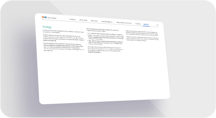 112 2021 ESG Report Transparency Appendices Responsible supply chain Product impact Climate change Introduction Healthy workforce and communities Strategy A summary of climate risks and opportunities that could have a substantive impact on our business is outlined below. We define substantive strategic risk as climate-related risks that have more variability and uncertainty over a longer time frame than is normally considered for financial risk. The majority of disclosures in this report fall under the category of substantive strategic risk. Any risk or opportunity that could result in a change in business operations, revenue or expenditure, thereby prompting disclosure in other company filings (e.g., 10-K) may be considered financially substantive for the purposes of TCFD-recommended and CDP disclosures. This applies to both supply chain and direct operations. When considering climate-related risks and opportunities, we define the magnitude of potential impact as follows: • Lo w – insignificant impact on revenues and/or minor disruption of operations. • Medium – some impact on r evenues and/or some disruption to operations, likely limited to a geographic region and/or number of business units. This may result in disclosure in financial reports. • High – signific ant impact on revenues and/or severe disruption to operations, likely affecting multiple regions and/or business units. This will likely result in disclosures in financial reports. We consider a short-term horizon to be up to three years in the context of climate-related risks and opportunities. This is in alignment with other general financial planning and business practices (such as financial planning for energy-efficiency projects). Medium-term time horizons are defined as three to 10 years in alignment with general financial planning and business processes with a medium-term outlook, such as power purchase agreements, which often have terms of around 10 years. Long-term time horizons are aligned with other business practices and long-term goals. For example, our company’s 2030+ goals with a 2019 baseline and carbon neutrality goals fit into a long-term time horizon.