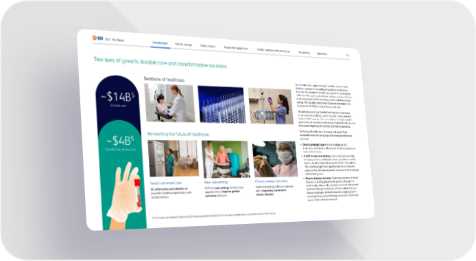 Our Durable Core—approximately $14 billion of our FY 2021 revenue—consists of our well-known products and solutions that form the backbone of healthcare around the world: blood collection tubes, ports and catheters; syringes; urinary catheters; acute care pumps and IV sets; hernia mesh; and blood culture testing. The Durable Core touches 90 percent of people in the hospital with 45 billion medical devices each year. The performance of our Durable Core fuels our investments in Transformative Solutions, which constitute about $4 billion of our FY 2021 revenue. These are advances in higher-growth spaces that are transforming the future of global healthcare and that we are targeting with our R&D and M&A investments. The future of healthcare is changing, and we see three irreversible forces that are going to be shaping healthcare in new ways. • Smart c onnected care : Artificial Intelligence (AI), informatics and robotics will transform healthcare processes, tools and treatments. • A shift to ne w care settings : Care is moving increasingly to surgery centers, ambulatory centers, retail clinics and the home, a trend accelerated during the COVID-19 pandemic. This is creating significant opportunities for us to reinvent solutions that will improve patient outcomes in these settings, while lowering costs. • Chr onic disease outcomes : Improving outcomes in chronic disease is a leading global health priority. Although it is traditionally addressed by the pharmaceutical industry with treatment through medication, BD has tackled infectious disease challenges and looks forward to stepping up in a meaningful way, using technology innovation to positively impact chronic disease treatment. Two axes of growth: durable core and transformative solutions Backbone of healthcare Reinventing the future of healthcare Smart connected care AI, informatics and robotics will transform healthcare processes, tools and treatments. New care settings Shift into new settings creates major opportunities to improve patient outcomes and costs. Chronic disease outcomes Medical technology will have a growing role in improving outcomes in chronic diseases. 5 FY21 revenue excluding $2.0 billion of COVID-only testing. Refer to the BD Q4 FY21 earnings presentation for a reconciliation back to GAAP revenue. ~$14B 5 Durable core ~$4B 5 Transformative solutions 15 2021 ESG Report Appendices Transparency Healthy workforce and communities Responsible supply chain Product impact Climate change Introduction