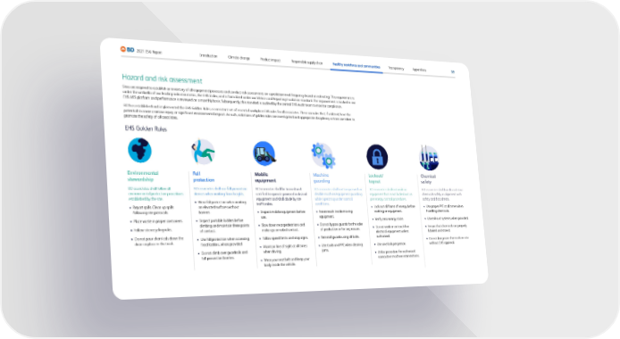 59 2021 ESG Report Appendices Transparency Responsible supply chain Product impact Climate change Introduction Healthy workforce and communities Hazard and risk assessment Sites are required to establish an inventory of all equipment/processes and conduct risk assessments on a predetermined frequency based on risk rating. This requirement is under the umbrella of our leading indicator metric, the EHS Index, and is formalized under our Metrics and Reporting Escalation standard. The improvement is tracked in our EHS MIS platform and performance is reviewed on a monthly basis. Subsequently, this standard is audited by the central EHS Audit team to monitor compliance. BD has established and implemented the EHS Golden Rules, a consistent set of essential workplace EHS rules for all associates. These are rules that, if violated, have the potential to cause a serious injury or significant environmental impact. As such, violations of golden rules are investigated and appropriate disciplinary actions are taken to promote the safety of all associates. EHS Golden Rules Environmental stewardship Fall protection Mobile equipment Machine guarding Lockout/ tagout Chemical safety BD associates shall follow all environmental protection procedures established by the site. • R eport spills. Clean up spills following site protocols. • Plac e waste in proper containers. • F ollow site recycling rules. • Do not pour chemic als down the drain or place in the trash. BD associates shall use fall prevention devices when working from heights. • W ear fall protection when working on elevated surfaces without barriers. • Inspect port able ladders before climbing and maintain three points of contact. • Use f all protection when accessing fixed ladders, where provided • Do not climb o ver guardrails and fall-prevention barriers. BD associates shall be trained and certified to operate powered industrial equipment and shall abide by site traffic rules. • Inspect mobile equipment bef ore use. • Slo w down near pedestrians and make eye or verbal contact. • F ollow speed limits and stop signs. • Maint ain line of sight at all times when driving. • W ear your seat belt and keep your body inside the vehicle. BD associates shall not tamper with or disable machine/equipment guarding while operating under normal conditions. • Ne ver reach inside moving equipment. • Do not b ypass guards for the sake of production or for any reason. • R einstall guards using all bolts. • Use t ools and PPE when clearing jams. BD associates shall not work on equipment that is not locked out as per energy control procedures. • Lock out all f orms of energy before working on equipment. • V erify zero energy state. • Do not w ork on or touch live electrical equipment unless authorized. • Use one lock per per son. • U tilize procedure for authorized nonroutine machine interventions. BD associates shall handle and store chemicals safely, in alignment with safety and data sheets. • Use pr oper PPE at all times when handling chemicals. • Use exhaust systems, when provided. • Ensur e that chemicals are properly labeled and stored. • Do not bring ne w chemicals on site without EHS approval.