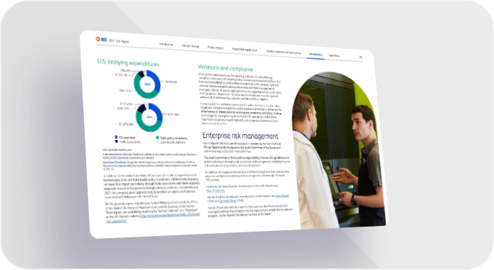 78 2021 ESG Report Healthy workforce and communities Appendices Responsible supply chain Product impact Climate change Introduction Transparency U.S. lobbying expenditures $89,295 $135,139 $991,516 $636,000 2020 $131,656 $287,397 $1,279,300 $701,000 2021 BD associat es Public polic y consultants T rade associations Issue-based c oalitions Data represents calendar years Trade associations: AdvaMed, Healthcare Institute of New Jersey, California Life Sciences Association, North Carolina Biosciences Organization, Bio Nebraska Issue-based Coalitions: Diagnostic Test Working Group, Medical Device Competitiveness Coalition, Physicians Fee Schedule Pathology Payment Coalition, United for Medical Research, Corporate Friends of CDC, Inc. In addition to the work of our Public Affairs team, BD is able to expand our reach by leveraging state and federal public policy consultants, collaboratively engaging on issues that impact our industry through trade associations and advancing policy proposals focused on key priorities through advocacy coalitions. For calendar year 2021, the company spent approximately $2.4 million on salaries and expenses associated with lobbying in the United States. We file quarterly reports regarding our federal lobbying activities with the Office of the Clerk of the House of Representatives and the Secretary of the Senate. These reports are available by searching for “Becton Dickinson” as a “Registrant” on the U.S. Senate’s website, http://www.senate.gov/legislative/Public_Disclosure/ LDA_reports.htm Violations and compliance BD maintains robust processes for reporting violations of, and validating compliance with, law and company policy. Company personnel who believe they have witnessed illegal or unethical behavior relating to the company’s political activities are encouraged to discuss the matter with their manager, senior managers, Human Resources representatives, the Legal department or the Ethics and Compliance department. Actual or potential violations may be reported without risk of retaliation by using the confidential Ethics Helpline. Company policies and bylaws governing BD’s political activities may be subject to periodic compliance validation and/or internal audit review to determine the effectiveness of implementation and ongoing compliance with policy. Findings and mitigation strategies may be reviewed with appropriate stakeholders. Significant exceptions may be reported to the Corporate Governance and Nominating Committee. Enterprise risk management Our Enterprise Risk Management program is overseen by the SVP Chief Risk Officer. Operationally he reports to the Audit Committee of the Board, and administratively to the chief financial officer. The Audit Committee of the Board has responsibility to review BD’s guidelines and policies relating to enterprise risk assessment and management, including financial risk, and cybersecurity and data privacy risk exposures. In addition, the Corporate Governance and Nominating Committee oversees BD’s processes and practices relating to the management and oversight of various ESG matters. Further details about how the Board oversees risk can be found in our Pro xy Statement . Details of risk factors relevant to our business can be found in our annual report (10-K) and quarterly filings (10-Q). Details of how risks related to specific ESG issues are identified, assessed and managed, and how they integrate into the organization’s overall risk management program, can be found in the relevant sections of this report.