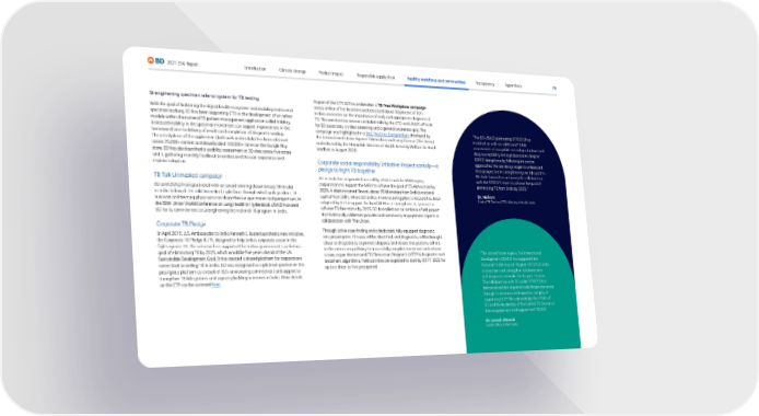 70 2021 ESG Report Transparency Responsible supply chain Product impact Climate change Introduction Healthy workforce and communities Appendices As part of the CTP, BD has undertaken a TB Free Workplace campaign across Indian office locations and sensitized about 50 percent of BD’s Indian associates on the importance of early and appropriate diagnosis of TB. The sensitization sessions included talks by the CTD and USAID officials for BD associates, a video screening and a general awareness quiz. The campaign was highlighted in a Best Practices Compendium developed by the International Union Against Tuberculosis and Lung Disease (The Union) and released by the Honorable Minister of Health & Family Welfare Dr. Harsh Vardhan in August 2020. Corporate social responsibility Initiative: Project sankalp—a pledge to fight TB together BD in India has responded to a call by USAID and the MOH urging corporations to support the MOH to achieve the goal of TB elimination by 2025. A district named Rewari, about 70 kilometers from India’s national capital New Delhi, where BD India’s manufacturing plant is located, has been adopted by BD to support the local MOH as it strengthens its systems to achieve TB-free status by 2025. BD has rolled out an ambitious field project that holistically addresses provider and community engagement aspects in collaboration with The Union. Through active case-finding and a dedicated, fully equipped diagnostic van, presumptive TB cases will be identified, and diagnostics will be brought closer to the patients to prevent dropouts and ensure that patients adhere to the entire care pathway to successfully complete treatment and achieve a cure, as per the National TB Elimination Program’s (NTEP’s) diagnostic and treatment algorithms. Field activities are expected to start by Q3 FY 2022 for up to a three-to-five-year period. Strengthening specimen referral system for TB testing With the goal of bolstering the digital health ecosystem and enabling end-to-end specimen tracking, BD has been supporting CTD in the development of an online module within the national TB patient management application called Nikshay. Increased visibility in the specimen movement can support improvement in the turnaround time to delivery of results and completion of diagnostic workup. The initial phase of the application (both web and mobile) has been released across 25,000+ centers and downloaded 100,000+ times on the Google Play store. BD has also launched a usability assessment at 30 sites across five states and is gathering monthly feedback to understand the user experience and improve adoption. TB Talk Unmasked campaign BD and USAID have partnered with an award-winning documentary filmmaker in India to launch TB Talk Unmasked, a platform through which policymakers, TB survivors and treating physicians can share their unique stories and perspectives. At the 50th Union World Conference on Lung Health in Hyderabad, USAID honored BD for its commitment to strengthening the national TB program in India. Corporate TB Pledge In April 2019, U.S. Ambassador to India Kenneth I. Juster launched a new initiative, the Corporate TB Pledge (CTP), designed to help India’s corporate sector in the fight against TB. The initiative has supported the Indian government’s ambitious goal of eliminating TB by 2025, which would be five years ahead of the UN Sustainable Development Goal. It has created a shared platform for corporations committed to ending TB in India. BD was recognized as a platinum partner on this prestigious platform as a result of BD’s unwavering commitment and support to strengthen TB lab systems and capacity building initiatives in India. More details on the CTP can be accessed here . “The BD-USAID partnership STRIDES has marched on with an additional 10 lab assessments at our public-sector liquid culture and drug susceptibility testing laboratories, despite COVID disruptions, by following innovative approaches. We are always eager to understand their perspective in strengthening our lab systems. We look forward to continuing the collaboration with the STRIDES team to achieve the goal of eliminating TB from India by 2025.” Dr. Nishant Central TB Division (CTD), Ministry of Health, India “The United States Agency for International Development (USAID) has supported the National TB Elimination Program (NTEP) of India to transform and strengthen its laboratories and diagnostic networks for the past 10 years. The collaboration with BD under STRIDES has demonstrated the important role the private sector, through its resources and expertise, can play in supporting NTEP. We acknowledge the efforts of BD and the leadership of the Central TB Division in their engagement and support for STRIDES.” Dr. Umesh Alavadi Health Office, USAID India