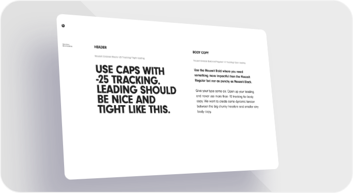 Beats Music Brand Guidelines HEADER BODY COPY Neuzeit Grotesk Black/ -25 Tracking/ Tight leading Neuzeit Grotesk Bold and Regular/ -10 Tracking/ Open leading USE CAPS WITH Use the Neuzeit Bold where you need something more impactful than the Neuzeit -25 TRACKING. Regular but nor as punchy as Neuzeit Black. LEADING SHOULD Give your type some air. Open up your leading and never use more than -10 tracking for body BE NICE AND copy. We want to create some dynamic tension between the big chunky headers and smaller airy TIGHT LIKE THIS. body copy.
