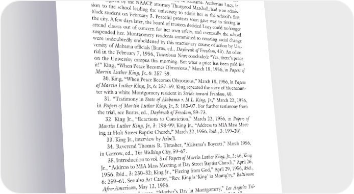 218 Notes to Pages 128–133 February 7, 1956, in Papers of Martin Luther King, Jr., 3: 127–28). Donald Ferron, “Report on MIA Mass Meeting,” February 27, 1956, in Burns, ed., Daybreak of Freedom, 174. 29. In February, nearby Tuscaloosa played host to a showdown over the court-ordered integration of the University of Alabama. Autherine Lucy, in a case argued by the NAACP attorney Thurgood Marshall, had won admis- sion to the school leading the university to admit her as the school’s first black student on February 3. Peaceful protests soon gave way to rioting in the city. A few days later, the board of trustees decided Lucy could no longer attend classes out of concern for her own safety, and eventually the school suspended her. Montgomery residents committed to resisting racial change were undoubtedly emboldened by this reactionary course of action by Uni- versity of Alabama officials (Burns, ed., Daybreak of Freedom, 43). An edito- rial in the February 7, 1956, Tuscaloosa News concluded: “Yes, there’s peace on the University campus this morning. But what a price has been paid for it!” King, “When Peace Becomes Obnoxious,” March 18, 1956, in Papers of Martin Luther King, Jr., 6: 257–59. 30. King, “When Peace Becomes Obnoxious,” March 18, 1956, in Papers of Martin Luther King, Jr., 6: 257–59. King repeated the story of his encoun- ter with a white Montgomery resident in Stride toward Freedom, 40. 31. “Testimony in State of Alabama v. M.L. King, Jr.,” March 22, 1956, in Papers of Martin Luther King, Jr., 3: 183–97. For further testimony from the trial, see Burns, ed., Daybreak of Freedom, 59–73. 32. King Jr., “Reactions to Conviction,” March 22, 1956, in Papers of Martin Luther King, Jr., 3: 198–99; King Jr., “Address to MIA Mass Meet- ing at Holt Street Baptist Church,” March 22, 1956, ibid., 3: 199–201. 33. King Jr., interview by Azbell. 34. Reverend Thomas R. Thrasher, “Alabama’s Boycott,” March 1956, in Garrow, ed., The Walking City, 59–67. 35. Introduction to vol. 3 of Papers of Martin Luther King, Jr., 3: 46; King Jr., “Address to MIA Mass Meeting at Day Street Baptist Church,” April 26, 1956, ibid., 3: 230–32; King Jr., “Fleeing from God,” April 29, 1956, ibid., 6: 259–61. See also Art Carter, “Rev. King is ‘King’ in Montg’ry,” Baltimore Afro-American, May 12, 1956. 36. Almena Lomax, “Mother’s Day in Montgomery,” Los Angeles Tri- bune, May 18, 1956, in Papers of Martin Luther King, Jr., 3: 263–67. 37. “Recommendations to MIA Executive Board,” May 1956, ibid., 3: 271–73. 38. On April 25, 1956, National City Lines informed the MIA that they would be unable to guarantee the hiring of African American bus drivers due