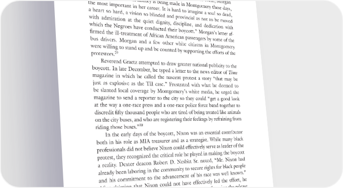 100 BECOMING KING A week after the boycott began, librarian Juliette Morgan penned a letter to the editor of the Montgomery Advertiser. She compared the goals and methods of the protestors to the effective efforts of Gandhi in India a few decades earlier. Impressed by the significance of the event, Morgan wrote: “One feels that history is being made in Montgomery these days, the most important in her career. It is hard to imagine a soul so dead, a heart so hard, a vision so blinded and provincial as not to be moved with admiration at the quiet dignity, discipline, and dedication with which the Negroes have conducted their boycott.” Morgan’s letter af- firmed the ill-treatment of African American passengers by some of the bus drivers. Morgan and a few other white citizens in Montgomery were willing to stand up and be counted by supporting the efforts of the 29 protestors. Reverend Graetz attempted to draw greater national publicity to the boycott. In late December, he typed a letter to the news editor of Time magazine in which he called the nascent protest a story “that may be just as explosive as the Till case.” Frustrated with what he deemed to be slanted local coverage by Montgomery’s white media, he urged the magazine to send a reporter to the city so they could “get a good look at the way a one-race press and a one-race police force band together to discredit fifty thousand people who are tired of being treated like animals on the city buses, and who are registering their feelings by refraining from 30 riding those buses.” In the early days of the boycott, Nixon was an essential contributor both in his role as MIA treasurer and as a strategist. While many black professionals did not believe Nixon could effectively serve as leader of the protest, they recognized the critical role he played in making the boycott a reality. Dexter deacon Robert D. Nesbitt Sr. noted, “Mr. Nixon had already been laboring in the community to secure rights for black people and his commitment to the advancement of his race was well known.” After claiming that Nixon could not have effectively led the effort, he quickly added: “He was a dynamic community man. Securing the release of Mrs. Parks and calling the meeting, seizing the moment to initiate a protest, and helping engineer the election of Martin are evidence of his Rufus Lewis saw things differently, believing Nixon had wanted insight.” the prestige of leadership for the movement he had helped engineer: “Mr.