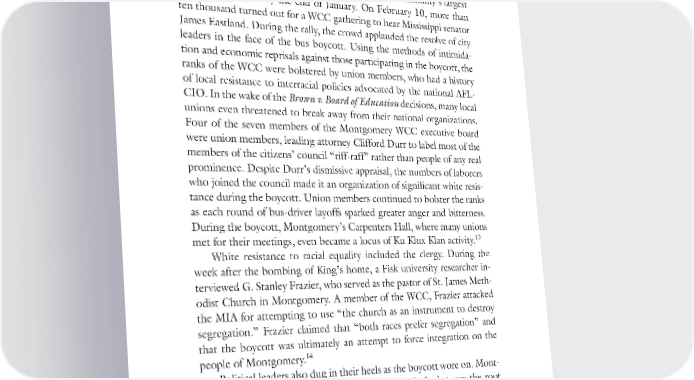 “Living under the Tension” 121 The MIA struggled to find appropriate responses in part because white attacks came from so many different directions. Many working-class whites expressed their solidarity with the city commissioners by joining the local White Citizens Council, which became the community’s largest white organization by the end of January. On February 10, more than ten thousand turned out for a WCC gathering to hear Mississippi senator James Eastland. During the rally, the crowd applauded the resolve of city leaders in the face of the bus boycott. Using the methods of intimida- tion and economic reprisals against those participating in the boycott, the ranks of the WCC were bolstered by union members, who had a history of local resistance to interracial policies advocated by the national AFL- CIO. In the wake of the Brown v. Board of Education decisions, many local unions even threatened to break away from their national organizations. Four of the seven members of the Montgomery WCC executive board were union members, leading attorney Clifford Durr to label most of the members of the citizens’ council “riff-raff” rather than people of any real prominence. Despite Durr’s dismissive appraisal, the numbers of laborers who joined the council made it an organization of significant white resis- tance during the boycott. Union members continued to bolster the ranks as each round of bus-driver layoffs sparked greater anger and bitterness. During the boycott, Montgomery’s Carpenters Hall, where many unions met for their meetings, even became a locus of Ku Klux Klan activity.13 White resistance to racial equality included the clergy. During the week after the bombing of King’s home, a Fisk university researcher in- terviewed G. Stanley Frazier, who served as the pastor of St. James Meth- odist Church in Montgomery. A member of the WCC, Frazier attacked the MIA for attempting to use “the church as an instrument to destroy segregation.” Frazier claimed that “both races prefer segregation” and that the boycott was ultimately an attempt to force integration on the 14 people of Montgomery. Political leaders also dug in their heels as the boycott wore on. Mont- gomery mayor, William “Tacky” Gayle, when asked what was the root cause of the bus boycott, responded: “Segregation. They want to destroy our whole social fabric. We have laws that they want to ignore.” Gayle complained that white women who were driving their maids to work and back were partly responsible for the success of the boycott. Virginia Durr