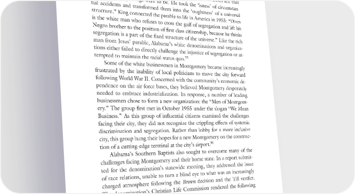 “Making a Contribution” 81 failed to fully address the needs of a beggar named Lazarus, resulting in eternal punishment for the wealthy man. For King, the man’s sin was not that he created the injustice but that “he felt that the gulf which existed between him and Lazarus was a proper condition of life. Dives felt that this was the way things were to be. He took the ‘isness’ of circumstan- tial accidents and transformed them into the ‘oughtness’ of a universal structure.” King connected the parable to life in America in 1955: “Dives is the white man who refuses to cross the gulf of segregation and lift his Negro brother to the position of first class citizenship, because he thinks segregation is a part of the fixed structure of the universe.” Like the rich man from Jesus’ parable, Alabama’s white denominations and organiza- tions either failed to directly challenge the injustice of segregation or at- 55 tempted to maintain the racial status quo. Some of the white businessmen in Montgomery became increasingly frustrated by the inability of local politicians to move the city forward following World War II. Concerned with the community’s economic de- pendence on the air force bases, they believed Montgomery desperately needed to embrace industrialization. In response, a number of leading businessmen chose to form a new organization: the “Men of Montgom- ery.” The group first met in October 1955 under the slogan “We Mean Business.” As this group of influential citizens examined the challenges facing their city, they did not recognize the crippling effects of systemic discrimination and segregation. Rather than lobby for a more inclusive city, this group hung their hopes for a new Montgomery on the construc- 56 tion of a cutting-edge terminal at the city’s airport. Alabama’s Southern Baptists also sought to overcome many of the challenges facing Montgomery and their home state. In a report submit- ted for the denomination’s statewide meeting, they addressed the issue of race relations, unable to turn a blind eye to what was an increasingly charged atmosphere following the Brown decision and the Till verdict. The denomination’s Christian Life Commission rendered the following report: In the south it is primarily a matter of the black and the white. The recent supreme court decision on desegregation is one of se- rious moment to the south. Only a dreaming idealist could close