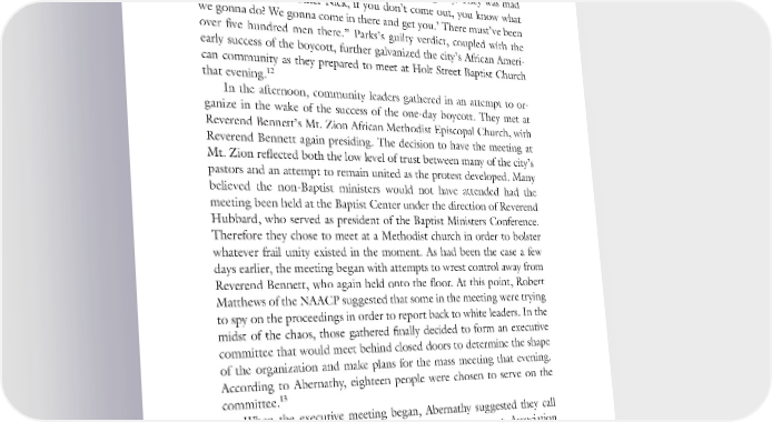 92 BECOMING KING the black man was born again in Montgomery. On that morning when they tried Mrs. Rosa Parks, the whole courtroom and all out in the street was crowded with black men. They was saying, ‘Brother Nick, Brother Nick, what’s happening?’ I tells them she’s found guilty. They was mad then. They said, ‘Brother Nick, if you don’t come out, you know what we gonna do? We gonna come in there and get you.’ There must’ve been over five hundred men there.” Parks’s guilty verdict, coupled with the early success of the boycott, further galvanized the city’s African Ameri- can community as they prepared to meet at Holt Street Baptist Church 12 that evening. In the afternoon, community leaders gathered in an attempt to or- ganize in the wake of the success of the one-day boycott. They met at Reverend Bennett’s Mt. Zion African Methodist Episcopal Church, with Reverend Bennett again presiding. The decision to have the meeting at Mt. Zion reflected both the low level of trust between many of the city’s pastors and an attempt to remain united as the protest developed. Many believed the non-Baptist ministers would not have attended had the meeting been held at the Baptist Center under the direction of Reverend Hubbard, who served as president of the Baptist Ministers Conference. Therefore they chose to meet at a Methodist church in order to bolster whatever frail unity existed in the moment. As had been the case a few days earlier, the meeting began with attempts to wrest control away from Reverend Bennett, who again held onto the floor. At this point, Robert Matthews of the NAACP suggested that some in the meeting were trying to spy on the proceedings in order to report back to white leaders. In the midst of the chaos, those gathered finally decided to form an executive committee that would meet behind closed doors to determine the shape of the organization and make plans for the mass meeting that evening. According to Abernathy, eighteen people were chosen to serve on the 13 committee. When the executive meeting began, Abernathy suggested they call their new organization the “Montgomery Improvement Association (MIA),” a proposal that was quickly accepted. The meeting’s momentum soon slowed as several leaders wanted to be able to keep their affiliation with the MIA secret. Most local clergy had learned to be cautious in chal- lenging racial mores, as they balanced advocating for their race while not