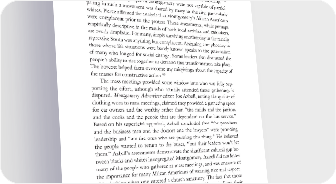 “Living under the Tension” 135 lander Folk School in Tennessee with Rosa Parks, Robert Graetz, and Al- abama State College professor J. E. Pierce, school director Myles Horton noted that during 1955 he had received letters from Nixon and Aubrey Williams saying “that the Negroes in Montgomery didn’t do anything.”42 The belief that the people of Montgomery were not capable of partici- pating in such a movement was shared by many in the city, particularly whites. Pierce affirmed the analysis that Montgomery’s African Americans were complacent prior to the protest. These assessments, while perhaps empirically descriptive in the minds of both local activists and onlookers, are overly simplistic. For many, simply surviving another day in the racially repressive South was anything but complacent. Assigning complacency to those whose life situations were barely known speaks to the paternalism of many who longed for social change. Some leaders also distrusted the people’s ability to rise together to demand that transformation take place. The boycott helped them overcome any misgivings about the capacity of the masses for constructive action.43 The mass meetings provided some window into who was fully sup- porting the effort, although who actually attended these gatherings is disputed. Montgomery Advertiser editor Joe Azbell, noting the quality of clothing worn to mass meetings, claimed they provided a gathering space for car owners and the wealthy rather than “the maids and the janitors and the cooks and the people that are dependent on the bus service.” Based on his superficial appraisal, Azbell concluded that “the preachers and the business men and the doctors and the lawyers” were providing leadership and “are the ones who are pushing this thing.” He believed the people wanted to return to the buses, “but their leaders won’t let them.” Azbell’s assessments demonstrate the significant cultural gap be- tween blacks and whites in segregated Montgomery. Azbell did not know many of the people who gathered at mass meetings, and was unaware of the importance for many African Americans of wearing nice and respect- able clothing when one entered a church sanctuary. The fact that those who attended mass meetings wore nice clothing did not indicate their social standing or how much money they had. He also underestimated the agency and self-determination of the working people who provided 44 the backbone of this movement. One wonders if the majority of the professional class was ever fully on