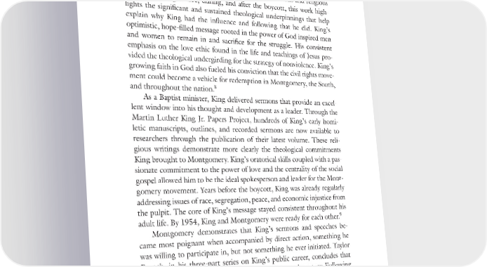 Prologue 5 the leading organizations pushing for social change in the South was the Southern Christian Leadership Conference. Recent studies have explored in greater depth the way religion, theology, and the church helped inspire and define the struggle. By examining the earliest sermons and religious writings of King before, during, and after the boycott, this work high- lights the significant and sustained theological underpinnings that help explain why King had the influence and following that he did. King’s optimistic, hope-filled message rooted in the power of God inspired men and women to remain in and sacrifice for the struggle. His consistent emphasis on the love ethic found in the life and teachings of Jesus pro- vided the theological undergirding for the strategy of nonviolence. King’s growing faith in God also fueled his conviction that the civil rights move- ment could become a vehicle for redemption in Montgomery, the South, 8 and throughout the nation. As a Baptist minister, King delivered sermons that provide an excel- lent window into his thought and development as a leader. Through the Martin Luther King Jr. Papers Project, hundreds of King’s early homi- letic manuscripts, outlines, and recorded sermons are now available to researchers through the publication of their latest volume. These reli- gious writings demonstrate more clearly the theological commitments King brought to Montgomery. King’s oratorical skills coupled with a pas- sionate commitment to the power of love and the centrality of the social gospel allowed him to be the ideal spokesperson and leader for the Mont- gomery movement. Years before the boycott, King was already regularly addressing issues of race, segregation, peace, and economic injustice from the pulpit. The core of King’s message stayed consistent throughout his 9 adult life. By 1954, King and Montgomery were ready for each other. Montgomery demonstrates that King’s sermons and speeches be- came most poignant when accompanied by direct action, something he was willing to participate in, but not something he ever initiated. Taylor Branch, in his three-part series on King’s public career, concludes that King’s inclination was to inspire social change through oratory. Following the bus boycott, he was unsure where the movement should go next, and “under these conditions, oratory grew upon him like a narcotic.” Unable to effectively transfer the model of the bus boycott to address other lo- cal challenges or broader regional injustice, King replaced nonviolent di-