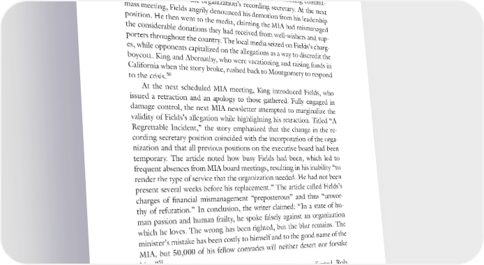 138 BECOMING KING dress the stated goals of the MIA, only to discover that part of the leader- 49 ship really wanted to end bus segregation in Montgomery. After being reprimanded by the executive committee, Fields had not been faithful in attending MIA meetings, leading a nominating commit- tee to replace him as the organization’s recording secretary. At the next mass meeting, Fields angrily denounced his demotion from his leadership position. He then went to the media, claiming the MIA had mismanaged the considerable donations they had received from well-wishers and sup- porters throughout the country. The local media seized on Fields’s charg- es, while opponents capitalized on the allegations as a way to discredit the boycott. King and Abernathy, who were vacationing and raising funds in California when the story broke, rushed back to Montgomery to respond 50 to the crisis. At the next scheduled MIA meeting, King introduced Fields, who issued a retraction and an apology to those gathered. Fully engaged in damage control, the next MIA newsletter attempted to marginalize the validity of Fields’s allegation while highlighting his retraction. Titled “A Regrettable Incident,” the story emphasized that the change in the re- cording secretary position coincided with the incorporation of the orga- nization and that all previous positions on the executive board had been temporary. The article noted how busy Fields had been, which led to frequent absences from MIA board meetings, resulting in his inability “to render the type of service that the organization needed. He had not been present several weeks before his replacement.” The article called Fields’s charges of financial mismanagement “preposterous” and thus “unwor- thy of refutation.” In conclusion, the writer claimed: “In a state of hu- man passion and human frailty, he spoke falsely against an organization which he loves. The wrong has been righted, but the blur remains. The minister’s mistake has been costly to himself and to the good name of the MIA, but 50,000 of his fellow comrades will neither desert nor forsake 51 him.” Other evidence suggests the matter was far more complicated. Rob- ert Graetz later claimed that Fields’s charges of financial mismanagement “reignited my own concerns about the way money was handled.” As the movement grew in prominence, leaders had opportunities to participate in MIA fund-raisers around the country. Graetz helped raise thousands