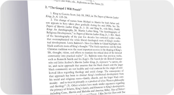 194 Notes to Pages 34–37 When Reeves took the stand in his trial, he “repudiated six confessions alleg- edly made to investigating officers” (Montgomery Advertiser, November 29, 1952). The jury reached a guilty verdict in thirty-eight minutes, and Reeves was sentenced to death (Montgomery Advertiser, November 30, 1952; De- cember 4, 5, 1952). Burns, To the Mountaintop, 1. 52. Vaughn and Wills, eds., Reflections on Our Pastor, 25. 2. “The Gospel I Will Preach” 1. King to Coretta Scott, July 18, 1952, in The Papers of Martin Luther King, Jr., 6: 123–26. 2. The change of names from Michael to Martin for both father and son appears to have taken place gradually during the mid-1930s. See The Papers of Martin Luther King, Jr., 1: 31; and King Sr., with Riley, Daddy King: An Autobiography, 26. Martin Luther King, “An Autobiography of Religious Development,” in Papers of Martin Luther King, Jr., 1: 361. Much of the historiography of the past few decades has corrected earlier works that overemphasized the white liberal theological roots of King’s intellec- tual development. Lewis Baldwin’s There Is a Balm in Gilead highlights the black southern roots of King’s thought: “The black experience and the black Christian tradition were the most important sources in the shaping of King’s life, thought, vision, and efforts to translate the ethical ideal of the beloved community into practical reality” (2). Baldwin notes that previous works, such as Kenneth Smith and Ira Zepp’s The Search for the Beloved Commu- nity and John Ansbro’s Martin Luther King, Jr., represent “a narrow, elit- ist, and racist approach that assumes that the black church and the larger black community are not healthy and vital contexts for the origin of intel- lectual ideas regarding theology and social change. The consequence of that approach has been to abstract King’s intellectual development from his social and religious roots—family, church, and the larger black com- munity—and to treat it primarily as a product of white Western philosophy and theology” (3). Other scholars have made similar arguments regarding the primacy of Atlanta, King’s family, and Ebenezer in King’s development, including Cone, Martin and Malcolm and America; Miller, Voice of Deliver- ance; Lischer, The Preacher King; and Dyson, I May Not Get There with You: The True Martin Luther King, Jr. 3. For a detailed account of the 1906 riot, see Mixon, The Atlanta Riot. For a thorough study of Atlanta in the 1930s and 1940s, see Ferguson, Black Politics in New Deal Atlanta. 4. Introduction to vol. 1 of Papers of Martin Luther King, Jr., 1: 6, 15,