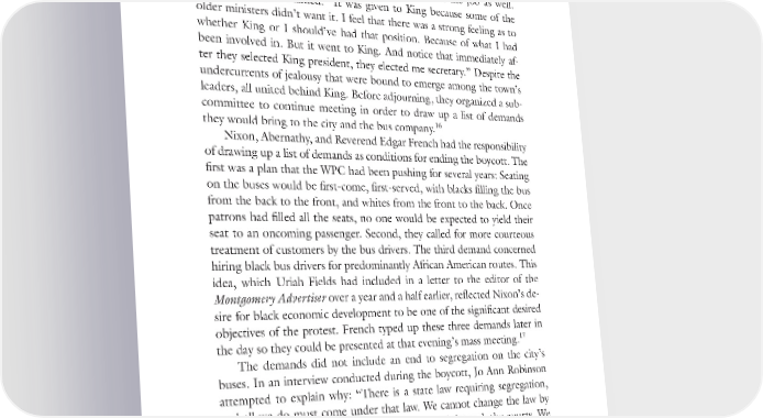94 BECOMING KING plications of his new role, King became president of the newly formed 15 MIA. Not everyone was enthusiastic about the decision to place King in charge of the new organization. Uriah Fields coveted the job as well. Years later, Fields claimed: “It was given to King because some of the older ministers didn’t want it. I feel that there was a strong feeling as to whether King or I should’ve had that position. Because of what I had been involved in. But it went to King. And notice that immediately af- ter they selected King president, they elected me secretary.” Despite the undercurrents of jealousy that were bound to emerge among the town’s leaders, all united behind King. Before adjourning, they organized a sub- committee to continue meeting in order to draw up a list of demands 16 they would bring to the city and the bus company. Nixon, Abernathy, and Reverend Edgar French had the responsibility of drawing up a list of demands as conditions for ending the boycott. The first was a plan that the WPC had been pushing for several years: Seating on the buses would be first-come, first-served, with blacks filling the bus from the back to the front, and whites from the front to the back. Once patrons had filled all the seats, no one would be expected to yield their seat to an oncoming passenger. Second, they called for more courteous treatment of customers by the bus drivers. The third demand concerned hiring black bus drivers for predominantly African American routes. This idea, which Uriah Fields had included in a letter to the editor of the Montgomery Advertiser over a year and a half earlier, reflected Nixon’s de- sire for black economic development to be one of the significant desired objectives of the protest. French typed up these three demands later in 17 the day so they could be presented at that evening’s mass meeting. The demands did not include an end to segregation on the city’s buses. In an interview conducted during the boycott, Jo Ann Robinson attempted to explain why: “There is a state law requiring segregation, and all we do must come under that law. We cannot change the law by protesting. It must be declared unconstitutional through the courts. We can get our demands under the present law, however, this protest is more far reaching than that. It is making the white man more respective of the Negro, and it shows him that the Negro can be a threat to his economic security which has kept him in his position of superiority to some ex-