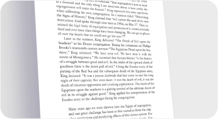 74 BECOMING KING persistence of prejudice in the hearts of some whites and the struggles of other minorities throughout the world: “We must be concerned because we are a part of humanity. Whatever affects one affects all.” Despite the intransigence of racism, King claimed that God acted through the 1954 Brown decision, leading him to conclude “that segregation is just as dead as a doornail and the only thing I am uncertain about is how costly the segregationist will make the funeral.” King espoused this same optimism when addressing his own congregation. In a sermon titled “Discerning the Signs of History,” King claimed that “evil carries the seed of its own destruction. God spoke through nine men in 1954, on May 17. They ex- amined the legal body of segregation and pronounced it constitutionally dead and ever since then things have been changing. We can go to places 42 all over the South that we could not go last year.” Later in the summer, King delivered “The Death of Evil upon the Seashore” to his Dexter congregation. Basing his comments on Phillips Brooks’s nineteenth-century sermon “The Egyptians Dead upon the Sea- shore,” King admitted: “We have seen evil. We have seen it walk the streets of Montgomery.” He surmised that human history “is the history of a struggle between good and evil. In the midst of the upward climb of goodness there is the down pull of evil.” Citing the Exodus story of the parting of the Red Sea and the subsequent death of the Egyptian army, King declared: “It was a joyous daybreak that had come to end the long night of their captivity. But even more, it was the death of evil; it was the death of inhuman oppression and crushing exploitation. The death of the Egyptians upon the seashore is a glaring symbol of the ultimate doom of evil in its struggle against good.” King applied his interpretation of the Exodus story to the challenges facing his congregation: Many years ago we were thrown into the Egypt of segregation, and our great challenge has been to free ourselves from the crip- pling restrictions and paralyzing effects of this vicious system. For years it looked like we would never get out of this Egypt. The Red Sea always stood before us with discouraging dimensions. But one day through a worldshaking decree by the Supreme Court of America and an awakened moral conscience of many white people, backed up by the Providence of God, the Red Sea