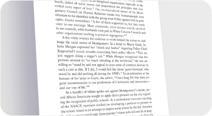 76 BECOMING KING Graetz developed a relationship with Robert Hughes, who served as the state director of the integrated Alabama Council on Human Rela- tions. The organization’s local chapter was one of the city’s few groups that brought blacks and whites together. As Graetz put it, “In the 1950s a white person taking part in an integrated organization, especially in the South, defied all social mores and jeopardized the principles that con- trolled every aspect of lives.” The countercultural nature of the Mont- gomery Council on Human Relations meant that businesspeople were reluctant to be identified with the group even if they agreed with its prin- ciples. Graetz remembers: “A few of them supported us, but they rarely came to our meetings. More commonly, wives became actively involved in our councils, while husbands took part in White Citizens Councils and 45 other organizations working to preserve segregation.” A few white women did continue to work behind the scenes to chal- lenge the racial mores of Montgomery. In a letter to Mayor Gayle, Ju- liette Morgan expressed her “shock and horror” regarding Police Chief Reppenthal’s recent remarks concerning black police officers: “They are just niggers doing a nigger’s job.” While Morgan recognized that her protests amount to “so much whistling at the whirlwind,” she was un- willing to “stand by and not appeal to your sense of common decency in such a case as this. If I did, I would feel like those ‘good Germans’ who stood by and did nothing all during the 1930’s.” In an addendum at the bottom of her letter to Gayle, she added, “I have long felt that there are great inconsistencies in our professions of Christianity and democracy— 46 and our way of life.” As a handful of whites spoke out against Montgomery’s racism, sev- eral African Americans sought to apply direct pressure on the city regard- ing the integration of public schools. At a midsummer executive meeting of the NAACP, members worked on developing a petition to present to the school board in an attempt to inspire some action by the fall. Attorney Fred Gray encouraged only those parents “whose jobs will not be in jeop- ardy” to sign the petition. The NAACP also continued to work through the courts, filing motions for new trials in both the Jeremiah Reeves and the Claudette Colvin cases. The minutes from the July meeting also indi- cate that the organization’s local president, Robert L. Matthews (whom Nixon had replaced as NAACP president in 1946), nominated Martin