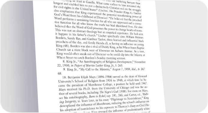 196 Notes to Pages 39–41 and Cone’s Malcolm and Martin and America. Lischer also elevates the sig- nificance of the African American preaching tradition, noting King “learned more from the Negro preacher’s methods of sustaining a people and ready- ing it for action than from any of his courses in graduate school; he absorbed more from his own church’s identification with the Suffering Servant than from anything he read in Gandhi. What came earliest to him remained the longest and enabled him to put a distinctively Christian seal on the struggle for civil rights in the United States” (Lischer, The Preacher King, 6). Lischer also emphasizes that King experienced the potential transforming power of God’s Word from his childhood at Ebenezer: “He believed that the preached Word performs a sustaining function for all who are oppressed and a correc- tive function for all who know the truth but lead disordered lives. He also believed that the Word of God possesses the power to change hearts of stone. This was not an abstract theology but an empirical experience. He had seen it happen in his father’s church.” Lischer specifically cites William Holmes Borders, Sandy Ray, and Gardner Taylor, three learned and influential black preachers of the day, and family friends all, as having an influence on young King (48). Borders was also a rival of Daddy King, as his Wheat Street Baptist Church sat a mere block west of Ebenezer on Auburn Avenue. As a teen, King would often sneak out of Ebenezer so he could slip into the balcony at Wheat Street to catch Borders’s Sunday morning sermon. 8. King Jr., “An Autobiography of Religious Development,” November 22, 1950, in Papers of Martin Luther King, Jr., 1: 263. 9. King Jr., “My Call to the Ministry,” August 7, 1959, ibid., 6: 367– 68. 10. Benjamin Elijah Mays (1894–1984) served as the dean of Howard University’s School of Religion from 1934 to 1940, at which time he be- came the president of Morehouse College, a position he held until 1967. Mays received his Ph.D. from the University of Chicago and was the au- thor of several books, including The Negro’s God (1938). For more on Mays, see his autobiography, Born to Rebel, esp. 191, 265; and Carter, ed., Walk- ing Integrity, xi. Years later, in his essay “Pilgrimage to Nonviolence,” King downplayed the influence of Morehouse, reducing the school’s influence on his adoption of nonviolence to his exposure to Thoreau’s Essay on Civil Dis- obedience. Throughout, King stressed the influence of predominantly white theologians, philosophers, and social thinkers, while downplaying many of the significant African American influences on his life and thought, including Mays (King Jr., Stride toward Freedom, 90–107). King sought input from George Kelsey, Stanley Levison, and Bayard Rustin in composing the essay (see King to Kelsey, March 31, 1958; Kelsey to King, April 4, 1958, in Papers