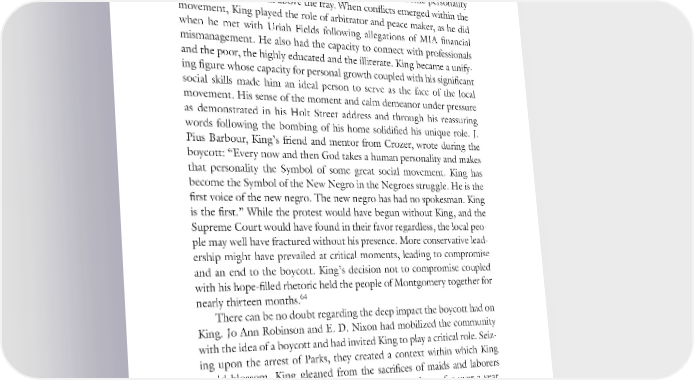 “Living under the Tension” 145 What then did King contribute to the Montgomery bus boycott? Perhaps most importantly, as he would say the following year, he became a symbol for the movement. He was better educated and more articulate than any of the other black pastors in the city. His winsome personality allowed him to remain above the fray. When conflicts emerged within the movement, King played the role of arbitrator and peace maker, as he did when he met with Uriah Fields following allegations of MIA financial mismanagement. He also had the capacity to connect with professionals and the poor, the highly educated and the illiterate. King became a unify- ing figure whose capacity for personal growth coupled with his significant social skills made him an ideal person to serve as the face of the local movement. His sense of the moment and calm demeanor under pressure as demonstrated in his Holt Street address and through his reassuring words following the bombing of his home solidified his unique role. J. Pius Barbour, King’s friend and mentor from Crozer, wrote during the boycott: “Every now and then God takes a human personality and makes that personality the Symbol of some great social movement. King has become the Symbol of the New Negro in the Negroes struggle. He is the first voice of the new negro. The new negro has had no spokesman. King is the first.” While the protest would have begun without King, and the Supreme Court would have found in their favor regardless, the local peo- ple may well have fractured without his presence. More conservative lead- ership might have prevailed at critical moments, leading to compromise and an end to the boycott. King’s decision not to compromise coupled with his hope-filled rhetoric held the people of Montgomery together for 64 nearly thirteen months. There can be no doubt regarding the deep impact the boycott had on King. Jo Ann Robinson and E. D. Nixon had mobilized the community with the idea of a boycott and had invited King to play a critical role. Seiz- ing upon the arrest of Parks, they created a context within which King could blossom. King gleaned from the sacrifices of maids and laborers who bore the brunt of the hardship by giving up buses for over a year. He also gained valuable experience as the president of the MIA, where he had to marshal resources, navigate through controversies and rivalries, and respond to crises with strategic thinking and skillful decision mak- ing. In addition, he learned the potentially pivotal role the media could