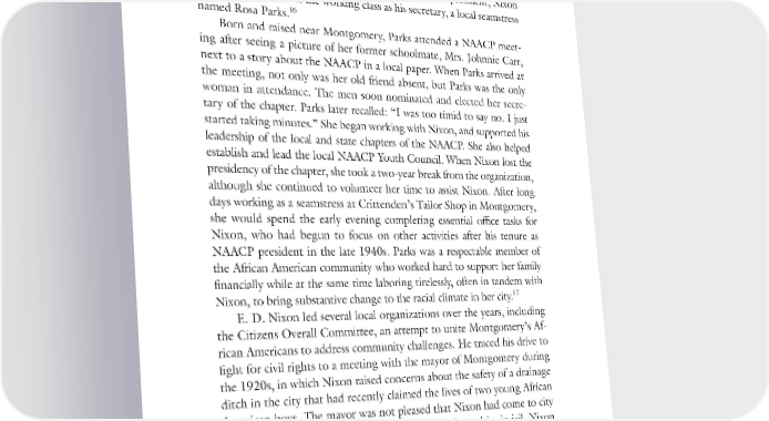 “The Stirring of the Water” 17 In what was described as the best turnout for an election in many years, Nixon was elected as the new president. For a few years, the local chap- ter of the NAACP was under leadership that represented the working- class African Americans in the city. During his tenure as president, Nixon relied on a member of the working class as his secretary, a local seamstress 16 named Rosa Parks. Born and raised near Montgomery, Parks attended a NAACP meet- ing after seeing a picture of her former schoolmate, Mrs. Johnnie Carr, next to a story about the NAACP in a local paper. When Parks arrived at the meeting, not only was her old friend absent, but Parks was the only woman in attendance. The men soon nominated and elected her secre- tary of the chapter. Parks later recalled: “I was too timid to say no. I just started taking minutes.” She began working with Nixon, and supported his leadership of the local and state chapters of the NAACP. She also helped establish and lead the local NAACP Youth Council. When Nixon lost the presidency of the chapter, she took a two-year break from the organization, although she continued to volunteer her time to assist Nixon. After long days working as a seamstress at Crittenden’s Tailor Shop in Montgomery, she would spend the early evening completing essential office tasks for Nixon, who had begun to focus on other activities after his tenure as NAACP president in the late 1940s. Parks was a respectable member of the African American community who worked hard to support her family financially while at the same time laboring tirelessly, often in tandem with 17 Nixon, to bring substantive change to the racial climate in her city. E. D. Nixon led several local organizations over the years, including the Citizens Overall Committee, an attempt to unite Montgomery’s Af- rican Americans to address community challenges. He traced his drive to fight for civil rights to a meeting with the mayor of Montgomery during the 1920s, in which Nixon raised concerns about the safety of a drainage ditch in the city that had recently claimed the lives of two young African American boys. The mayor was not pleased that Nixon had come to city hall with the grievance, and even threatened to throw him in jail. Nixon remembered: “After that incident, I knew there would not be any recre- ation or any form of civil rights for black people unless they were ready and willing to get out and fight for it.” He put this philosophy into action 18 over the following decades.