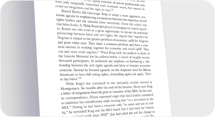 “Bigger Than Montgomery” 155 in several southern cities, registering more voters, testing integration at southern restaurants, and “continuous intelligent agitation for imple- mentation of the Supreme Court Decision.” While Borders lobbied for a more clearly defined agenda for the Washington, D.C., event, his civil rights agenda reflected the typical concerns of activist professionals who were only marginally concerned with economic issues, but instead fo- 10 cused on integration and the right to vote. Bayard Rustin did encourage King to adopt a more aggressive eco- nomic agenda by emphasizing connections between the objectives of civil rights leaders and the national labor movement. Given the critical role that labor leader A. Philip Randolph played in bringing the march togeth- er, Rustin saw this event as a great opportunity to elevate the potential partnership between labor and civil rights. He argued that “equality for Negroes is related to the greater problem of economic uplift for Negroes and poor white men. They share a common problem and have a com- mon interest in working together for economic and social uplift. They can and must work together.” When King took the podium in front of the Lincoln Memorial for his address before a crowd of roughly twenty thousand participants, he eschewed any emphasis on furthering a rela- tionship between the civil rights agenda and labor or broader economic concerns. Instead he focused squarely on the desperate need for African Americans to have full voting rights, demanding again and again, “Give 11 us the ballot.” While King’s star continued to rise nationally, trouble brewed in Montgomery. Six months after the end of the boycott, Nixon sent King a letter of resignation from his post as treasurer of the MIA. In the caus- tic correspondence, Nixon expressed anger that local leaders continued to minimize his contributions while treating him “as a newcomer to the MIA.” Noting he had been a treasurer only “in name and not in real- ity,” he reminded King and the MIA board that it had been his “dream, hope and hard work since 1932” that had tilled the soil for change in the community. A few weeks later, King and Abernathy met with Nix- on in an attempt to pacify the fiery Pullman porter. They managed to convince Nixon to remain with the organization as treasurer, suggesting they would change some of the organization’s financial practices that had caused him concern for some time. Despite the truce, distrust between