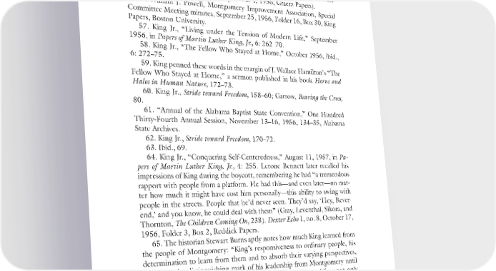 220 Notes to Pages 141–146 claimed he was most concerned about Mayor Gayle’s assertion that blacks had done it for publicity: “And apparently the police have been ordered to find the colored people who did it, or at least someone that it can conve- niently be blamed on. At least four colored men have been arrested with the bombing” (Graetz to Brownell, September 4, 1956, Graetz Papers). 56. William J. Powell, Montgomery Improvement Association, Special Committee Meeting minutes, September 25, 1956, Folder 16, Box 30, King Papers, Boston University. 57. King Jr., “Living under the Tension of Modern Life,” September 1956, in Papers of Martin Luther King, Jr., 6: 262–70. 58. King Jr., “The Fellow Who Stayed at Home,” October 1956, ibid., 6: 272–75. 59. King penned these words in the margin of J. Wallace Hamilton’s “The Fellow Who Stayed at Home,” a sermon published in his book Horns and Halos in Human Nature, 172–73. 60. King Jr., Stride toward Freedom, 158–60; Garrow, Bearing the Cross, 80. 61. “Annual of the Alabama Baptist State Convention,” One Hundred Thirty-Fourth Annual Session, November 13–16, 1956, 134–35, Alabama State Archives. 62. King Jr., Stride toward Freedom, 170–72. 63. Ibid., 69. 64. King Jr., “Conquering Self-Centeredness,” August 11, 1957, in Pa- pers of Martin Luther King, Jr., 4: 255. Lerone Bennett later recalled his impressions of King during the boycott, remembering he had “a tremendous rapport with people from a platform. He had this—and even later—no mat- ter how much it might have cost him personally—this ability to swing with people in the streets. People that he’d never seen. They’d say, ‘Hey, Rever- end,’ and you know, he could deal with them” (Gray, Leventhal, Sikora, and Thornton, The Children Coming On, 238). Dexter Echo 1, no. 8, October 17, 1956, Folder 3, Box 2, Reddick Papers. 65. The historian Stewart Burns aptly notes how much King learned from the people of Montgomery: “King’s responsiveness to ordinary people, his determination to learn from them and to absorb their varying perspectives, represented a distinguishing mark of his leadership from Montgomery until the end of his life.” He continues: “Subleaders and foot soldiers not only strengthened his commitment but also emboldened him to take further risks and to rise above his comfort zone and socialization” (Burns, ed., Daybreak of Freedom, 15). 66. King Jr., “We Are Still Walking,” Liberation, December 1956. The