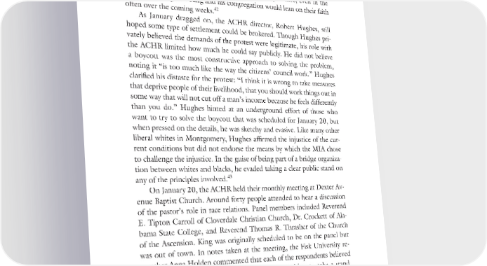 106 BECOMING KING a world of no God.” The sermon contained no easy answers. His philo- sophical responses seem hollow given the challenges facing both he and his congregation. Perhaps they knew no high-minded theological treatise could substitute for the daily experience of God’s presence, even in the midst of glaring evil. King and his congregation would lean on their faith 42 often over the coming weeks. As January dragged on, the ACHR director, Robert Hughes, still hoped some type of settlement could be brokered. Though Hughes pri- vately believed the demands of the protest were legitimate, his role with the ACHR limited how much he could say publicly. He did not believe a boycott was the most constructive approach to solving the problem, noting it “is too much like the way the citizens’ council work.” Hughes clarified his distaste for the protest: “I think it is wrong to take measures that deprive people of their livelihood, that you should work things out in some way that will not cut off a man’s income because he feels differently than you do.” Hughes hinted at an underground effort of those who want to try to solve the boycott that was scheduled for January 20, but when pressed on the details, he was sketchy and evasive. Like many other liberal whites in Montgomery, Hughes affirmed the injustice of the cur- rent conditions but did not endorse the means by which the MIA chose to challenge the injustice. In the guise of being part of a bridge organiza- tion between whites and blacks, he evaded taking a clear public stand on 43 any of the principles involved. On January 20, the ACHR held their monthly meeting at Dexter Av- enue Baptist Church. Around forty people attended to hear a discussion of the pastor’s role in race relations. Panel members included Reverend E. Tipton Carroll of Cloverdale Christian Church, Dr. Crockett of Ala- bama State College, and Reverend Thomas R. Thrasher of the Church of the Ascension. King was originally scheduled to be on the panel but was out of town. In notes taken at the meeting, the Fisk University re- searcher Anna Holden commented that each of the respondents believed there were times when one should risk one’s position to take a stand, and they all admitted a reluctance to do so. In the question-and-answer period, Clara Rutledge recommended a recent Reader’s Digest article to the group titled “The Churches Repent,” which examined the outcome for some churches that chose to integrate. At the close of the meeting,