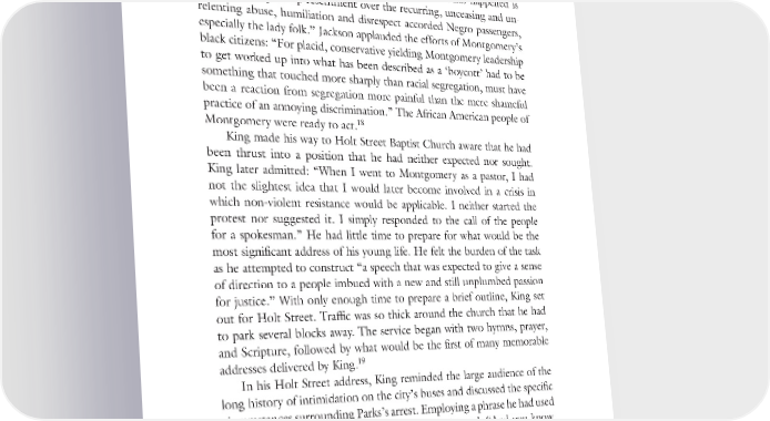 “They Are Willing to Walk” 95 tent.” Alabama Tribune editor Emory O. Jackson basically agreed with Robinson’s assessment, noting that the boycott was only “incidentally a protest against segregation. That is the first observation, it seems to me, which should be emphasized and kept in mind. What has happened is the release of pent up resentment over the recurring, unceasing and un- relenting abuse, humiliation and disrespect accorded Negro passengers, especially the lady folk.” Jackson applauded the efforts of Montgomery’s black citizens: “For placid, conservative yielding Montgomery leadership to get worked up into what has been described as a ‘boycott’ had to be something that touched more sharply than racial segregation, must have been a reaction from segregation more painful than the mere shameful practice of an annoying discrimination.” The African American people of 18 Montgomery were ready to act. King made his way to Holt Street Baptist Church aware that he had been thrust into a position that he had neither expected nor sought. King later admitted: “When I went to Montgomery as a pastor, I had not the slightest idea that I would later become involved in a crisis in which non-violent resistance would be applicable. I neither started the protest nor suggested it. I simply responded to the call of the people for a spokesman.” He had little time to prepare for what would be the most significant address of his young life. He felt the burden of the task as he attempted to construct “a speech that was expected to give a sense of direction to a people imbued with a new and still unplumbed passion for justice.” With only enough time to prepare a brief outline, King set out for Holt Street. Traffic was so thick around the church that he had to park several blocks away. The service began with two hymns, prayer, and Scripture, followed by what would be the first of many memorable 19 addresses delivered by King. In his Holt Street address, King reminded the large audience of the long history of intimidation on the city’s buses and discussed the specific circumstances surrounding Parks’s arrest. Employing a phrase he had used the day before in his sermon at Dexter, King charged, “And you know, my friends, there comes a time when people get tired of being trampled over by the iron feet of oppression.” Aware of the history of divisions among the city’s black community, King called for unity as they worked together for justice. In his stirring conclusion, King proclaimed: “Right