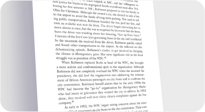 “The Stirring of the Water” 29 volved in every movement that had as its goal the freedom of her race.” With the support of many of the city’s most prominent black women, the 42 WPC was primed to play a critical role in local politics. No member of the WPC was more active than Jo Ann Robinson. She came to Montgomery to teach English at ASC, and her willingness to seek justice for blacks in the segregated South crystallized soon after. Fol- lowing her first semester at ASC, Robinson prepared to visit her family in Ohio for Christmas. Although she owned a car, she elected to take a bus to the airport to avoid the hassle of long-term parking. Not used to rid- ing public transportation, Robinson boarded the bus, paid her fare, and took an available seat near the front. The driver began instructing her to move almost at once, but she was so surprised by his words that she froze. Soon the driver was standing above her shouting, “Get up from there.” Unaware of the Jim Crow laws governing buses in the city and humiliated by the treatment she received from the driver, Robinson quickly exited and found other transportation to the airport. As she reflected on this dehumanizing episode, Robinson’s resolve to get involved in changing the climate in Montgomery grew. Her most significant role in the local 43 struggle was as president of the WPC. When Robinson replaced Burks as head of the WPC, she brought a more activist and confrontational spirit to the organization. Although Robinson did not completely overhaul the WPC when she assumed the presidency, she did lead the organization into addressing the mistreat- ment of African American passengers on city buses and to confront the city commission. Robinson herself admits that by the early 1950s the WPC had become the “go-to” organization for Montgomery blacks who had issues or grievances they wanted the city to address. In 1953 alone, they received well over thirty citizen complaints against the bus company.44 As early as 1952, the WPC began raising concerns about the treat- ment of black passengers on city buses to the city commission. Their com- plaints included a seating arrangement that reserved the front ten seats for whites, whether the bus had any white riders or not. If whites boarded the bus and there were no available seats in the first ten rows, the black passengers in the seats closest to the front were frequently ordered by the driver to relinquish their seats. Adding to the frustration was the lack of
