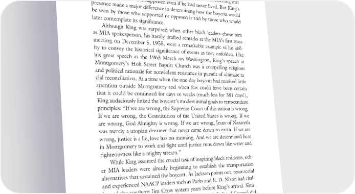Introduction xiii with far-reaching implications for race relations in the United States and throughout the world. The Montgomery Improvement Association (MIA) had numerous other leaders capable of mobilizing and sustaining a mass movement, and King was not being overly modest in asserting that the boycott would have happened even if he had never lived. But King’s presence made a major difference in determining how the boycott would be seen by those who supported or opposed it and by those who would later contemplate its significance. Although King was surprised when other black leaders chose him as MIA spokesperson, his hastily drafted remarks at the MIA’s first mass meeting on December 5, 1955, were a remarkable example of his abil- ity to convey the historical significance of events as they unfolded. Like his great speech at the 1963 March on Washington, King’s speech at Montgomery’s Holt Street Baptist Church was a compelling religious and political rationale for nonviolent resistance in pursuit of ultimate ra- cial reconciliation. At a time when the one-day boycott had received little attention outside Montgomery and when few could have been certain that it could be continued for days or weeks (much less for 381 days!), King audaciously linked the boycott’s modest initial goals to transcendent principles: “If we are wrong, the Supreme Court of this nation is wrong. If we are wrong, the Constitution of the United States is wrong. If we are wrong, God Almighty is wrong. If we are wrong, Jesus of Nazareth was merely a utopian dreamer that never came down to earth. If we are wrong, justice is a lie, love has no meaning. And we are determined here in Montgomery to work and fight until justice runs down like water and righteousness like a mighty stream.” While King assumed the crucial task of inspiring black residents, oth- er MIA leaders were already beginning to establish the transportation alternatives that sustained the boycott. As Jackson points out, resourceful and experienced NAACP leaders such as Parks and E. D. Nixon had chal- lenged the southern Jim Crow system years before King’s arrival. Simi- larly, Jo Ann Robinson of Montgomery’s Women’s Political Council did not require King’s guidance before drafting and duplicating thousands of leaflets urging residents to stay off buses. These individuals, along with others such as Ralph Abernathy, might well have gained more promi- nence if they had not been overshadowed by King. Still, although the