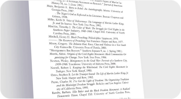 238 Bibliography Lofton, Fred C., ed. Our Help in Ages Past: Sermons from Morehouse. Elgin, Ill.: Progressive National Baptist Convention, 1987. Marsh, Charles. The Beloved Community: How Faith Shapes Social Justice from the Civil Rights Movement to Today. New York: Basic Books, 2005. Martin Luther King, Jr. Papers Project. “The Student Papers of Martin Lu- ther King, Jr.: A Summary Statement on Research.” Journal of American History 78, no. 1 (June 1991). Mays, Benjamin E. Born to Rebel: An Autobiography. Athens: University of Georgia Press, 1987. ———. The Negro’s God as Reflected in his Literature. Boston: Chapman and Grimes, 1938. Miller, Keith D. Voice of Deliverance: The Language of Martin Luther King, Jr. and Its Sources. New York: Free Press, 1992. Minchin, Timothy J. The Color of Work: The Struggle for Civil Rights in the Southern Paper Industry, 1945–1980. Chapel Hill: University of North Carolina Press, 2001. Mitchell, Henry H. Black Preaching. Philadelphia: Lippincott, 1970. ———. The Recovery of Preaching. San Francisco: Harper and Row, 1977. Mixon, Gregory. The Atlanta Riot: Race, Class and Violence in a New South City. Gainesville: University Press of Florida, 2005. “Montgomery Bus Boycott.” Southern Exposure 9, no. 1 (Spring 1981). Morris, Aldon. Origins of the Civil Rights Movement: Black Communities Or- ganizing for Change. New York: Free Press, 1984. Newton, Wesley. Montgomery in the Good War: Portrait of a Southern City, 1939–1946. Tuscaloosa: University of Alabama Press, 2000. Norrell, Robert J. Reaping the Whirlwind: The Civil Rights Movement in Tuskegee. New York: Knopf, 1985. Oates, Stephen B. Let the Trumpet Sound: The Life of Martin Luther King, Jr. New York: Harper and Row, 1982. Payne, Charles M. I’ve Got the Light of Freedom: The Organizing Tradition and the Mississippi Freedom Struggle. Berkeley and Los Angeles: Univer- sity of California Press, 1995. Ransby, Barbara. Ella Baker and the Black Freedom Movement: A Radical Democratic Vision. Chapel Hill: University of North Carolina Press, 2003. Roberson, Houston Bryan. Fighting the Good Fight: The Story of Dexter Av- enue King Memorial Baptist Church, 1865–1977. New York: Routledge, 2005. Rogers, William Warren, Jr. Confederate Home Front: Montgomery during the Civil War. Tuscaloosa: University of Alabama Press, 1999.