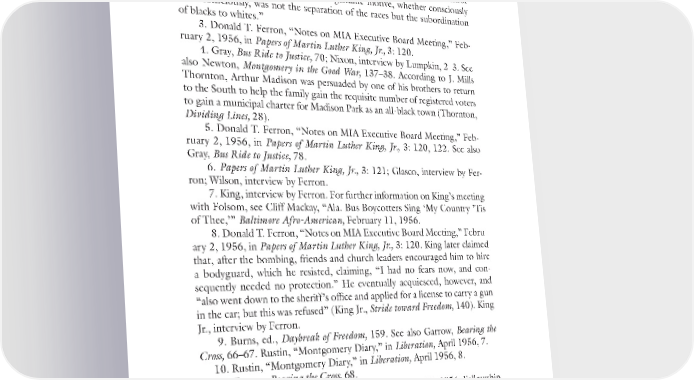 216 Notes to Pages 116–121 to extend the bus boycott indefinitely. While satisfying the conditions may have ended the boycott, it would not necessarily have ended the legal battle. Thornton more accurately describes the perspective of the white leadership in writing: “Segregation on the initiative of blacks and under black control was unacceptable because authorities’ genuine motive, whether consciously or unconsciously, was not the separation of the races but the subordination of blacks to whites.” 3. Donald T. Ferron, “Notes on MIA Executive Board Meeting,” Feb- ruary 2, 1956, in Papers of Martin Luther King, Jr., 3: 120. 4. Gray, Bus Ride to Justice, 70; Nixon, interview by Lumpkin, 2–3. See also Newton, Montgomery in the Good War, 137–38. According to J. Mills Thornton, Arthur Madison was persuaded by one of his brothers to return to the South to help the family gain the requisite number of registered voters to gain a municipal charter for Madison Park as an all-black town (Thornton, Dividing Lines, 28). 5. Donald T. Ferron, “Notes on MIA Executive Board Meeting,” Feb- ruary 2, 1956, in Papers of Martin Luther King, Jr., 3: 120, 122. See also Gray, Bus Ride to Justice, 78. 6. Papers of Martin Luther King, Jr., 3: 121; Glasco, interview by Fer- ron; Wilson, interview by Ferron. 7. King, interview by Ferron. For further information on King’s meeting with Folsom, see Cliff Mackay, “Ala. Bus Boycotters Sing ‘My Country ’Tis of Thee,’” Baltimore Afro-American, February 11, 1956. 8. Donald T. Ferron, “Notes on MIA Executive Board Meeting,” Febru- ary 2, 1956, in Papers of Martin Luther King, Jr., 3: 120. King later claimed that, after the bombing, friends and church leaders encouraged him to hire a bodyguard, which he resisted, claiming, “I had no fears now, and con- sequently needed no protection.” He eventually acquiesced, however, and “also went down to the sheriff’s office and applied for a license to carry a gun in the car; but this was refused” (King Jr., Stride toward Freedom, 140). King Jr., interview by Ferron. 9. Burns, ed., Daybreak of Freedom, 159. See also Garrow, Bearing the Cross, 66–67. Rustin, “Montgomery Diary,” in Liberation, April 1956, 7. 10. Rustin, “Montgomery Diary,” in Liberation, April 1956, 8. 11. Garrow, Bearing the Cross, 68. 12. John M. Swomley Jr. to Glenn Smiley, February 29, 1956, Fellowship of Reconciliation Papers; Garrow, Bearing the Cross, 70. 13. Burns, ed., Daybreak of Freedom, 153–54; Draper, Conflict of Interests, 22–24; Clifford Durr, interview by Holden. See also Montgomery Advertiser, February 11, 1956. Draper, Conflict of Interests, 31–32.