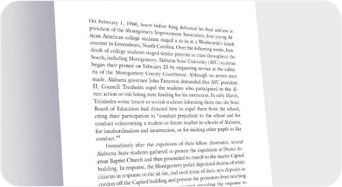 Epilogue On February 1, 1960, hours before King delivered his final address as president of the Montgomery Improvement Association, four young Af- rican American college students staged a sit-in at a Woolworth’s lunch counter in Greensboro, North Carolina. Over the following weeks, hun- dreds of college students staged similar protests in cities throughout the South, including Montgomery. Alabama State University (ASU) students began their protest on February 25 by requesting service at the cafete- ria of the Montgomery County Courthouse. Although no arrests were made, Alabama governor John Patterson demanded that ASU president H. Councill Trenholm expel the students who participated in this di- rect action or risk losing state funding for his institution. In early March, Trenholm wrote letters to several students informing them that the State Board of Education had directed him to expel them from the school, citing their participation in “conduct prejudicial to the school and for conduct unbecoming a student or future teacher in schools of Alabama, for insubordination and insurrection, or for inciting other pupils to like conduct.”1 Immediately after the expulsions of their fellow classmates, several Alabama State students gathered to protest the expulsions at Dexter Av- enue Baptist Church and then proceeded to march to the nearby Capitol building. In response, the Montgomery police deputized dozens of white citizens in response to the sit-ins, and used many of these new deputies to cordon off the Capitol building and prevent the protestors from reaching their destination. Virginia Durr commented regarding the response to the sit-ins and demonstrations: “You never saw such unanimity in your life as there seems to be in the white community, although privately some dissent, but not many.” Meanwhile, the campus of Alabama State was divided over the issue, with some professors supporting the protestors, while others worked to preserve their jobs. Still, for the first time since 181
