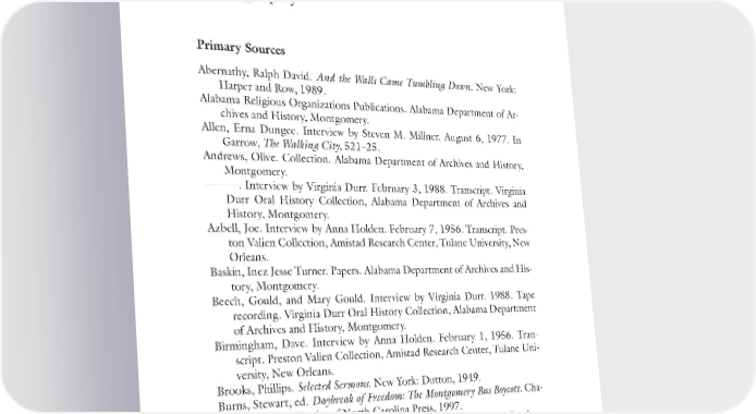 Bibliography Primary Sources Abernathy, Ralph David. And the Walls Came Tumbling Down. New York: Harper and Row, 1989. Alabama Religious Organizations Publications. Alabama Department of Ar- chives and History, Montgomery. Allen, Erna Dungee. Interview by Steven M. Millner. August 6, 1977. In Garrow, The Walking City, 521–25. Andrews, Olive. Collection. Alabama Department of Archives and History, Montgomery. ———. Interview by Virginia Durr. February 3, 1988. Transcript. Virginia Durr Oral History Collection, Alabama Department of Archives and History, Montgomery. Azbell, Joe. Interview by Anna Holden. February 7, 1956. Transcript. Pres- ton Valien Collection, Amistad Research Center, Tulane University, New Orleans. Baskin, Inez Jesse Turner. Papers. Alabama Department of Archives and His- tory, Montgomery. Beech, Gould, and Mary Gould. Interview by Virginia Durr. 1988. Tape recording. Virginia Durr Oral History Collection, Alabama Department of Archives and History, Montgomery. Birmingham, Dave. Interview by Anna Holden. February 1, 1956. Tran- script. Preston Valien Collection, Amistad Research Center, Tulane Uni- versity, New Orleans. Brooks, Phillips. Selected Sermons. New York: Dutton, 1949. Burns, Stewart, ed. Daybreak of Freedom: The Montgomery Bus Boycott. Cha- pel Hill: University of North Carolina Press, 1997. Buttrick, George. The Parables of Jesus. New York: Harper and Brothers, 1928. Carbado, Devon W., and Donald Weise, eds. Time on Two Crosses: The Col- lected Writings of Bayard Rustin. San Francisco: Cleis Press, 2003. Carr, Johnnie. Interview by Steven M. Millner. July 17, 1977. In Garrow, ed., The Walking City, 527–32. 229