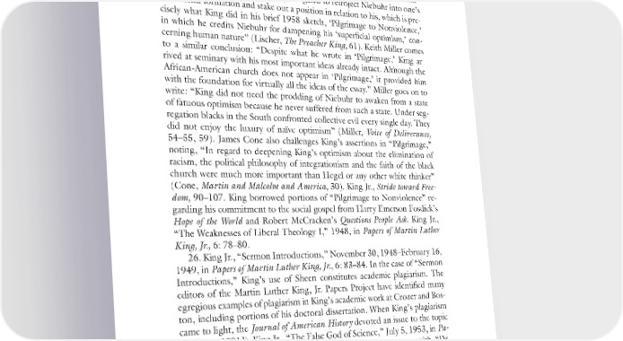 Notes to Pages 47–48 199 25. Lischer, for instance, deemphasizes the influence of theologians on King’s thinking: “Profound changes in the graduate student’s thinking can- not be attributed to Niebuhr despite the mature King’s need to make it appear that Niebuhr had once made a decisive difference. Such was the domi- nance of Niebuhr: one was virtually obligated to retroject Niebuhr into one’s intellectual formation and stake out a position in relation to his, which is pre- cisely what King did in his brief 1958 sketch, ‘Pilgrimage to Nonviolence,’ in which he credits Niebuhr for dampening his ‘superficial optimism,’ con- cerning human nature” (Lischer, The Preacher King, 61). Keith Miller comes to a similar conclusion: “Despite what he wrote in ‘Pilgrimage,’ King ar- rived at seminary with his most important ideas already intact. Although the African-American church does not appear in ‘Pilgrimage,’ it provided him with the foundation for virtually all the ideas of the essay.” Miller goes on to write: “King did not need the prodding of Niebuhr to awaken from a state of fatuous optimism because he never suffered from such a state. Under seg- regation blacks in the South confronted collective evil every single day. They did not enjoy the luxury of naïve optimism” (Miller, Voice of Deliverance, 54–55, 59). James Cone also challenges King’s assertions in “Pilgrimage,” noting, “In regard to deepening King’s optimism about the elimination of racism, the political philosophy of integrationism and the faith of the black church were much more important than Hegel or any other white thinker” (Cone, Martin and Malcolm and America, 30). King Jr., Stride toward Free- dom, 90–107. King borrowed portions of “Pilgrimage to Nonviolence” re- garding his commitment to the social gospel from Harry Emerson Fosdick’s Hope of the World and Robert McCracken’s Questions People Ask. King Jr., “The Weaknesses of Liberal Theology I,” 1948, in Papers of Martin Luther King, Jr., 6: 78–80. 26. King Jr., “Sermon Introductions,” November 30, 1948–February 16, 1949, in Papers of Martin Luther King, Jr., 6: 83–84. In the case of “Sermon Introductions,” King’s use of Sheen constitutes academic plagiarism. The editors of the Martin Luther King, Jr. Papers Project have identified many egregious examples of plagiarism in King’s academic work at Crozer and Bos- ton, including portions of his doctoral dissertation. When King’s plagiarism came to light, the Journal of American History devoted an issue to the topic (78 [June 1991]). King Jr., “The False God of Science,” July 5, 1953, in Pa- pers of Martin Luther King, Jr., 6: 130–32. King began his sermon with, “Dr. William Ernest Hecking has said that all life is divided into work and worship; that which we do for ourselves and that which we let the higher than ourselves do.” Fosdick’s sermon begins, “Professor Hocking is right in saying that all man’s life can be reduced to two aspects, work and worship—that which we