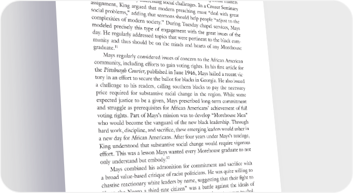 “The Gospel I Will Preach” 41 a major impact on the language and themes that became staples of King’s 10 preaching and thought. One of the criticisms King often leveled against the traditional black church was its tendency to deal almost exclusively with spiritual matters while not consistently addressing social challenges. In a Crozer Seminary assignment, King argued that modern preaching must “deal with great social problems,” adding that sermons should help people “adjust to the complexities of modern society.” During Tuesday chapel services, Mays modeled precisely this type of engagement with the great issues of the day. He regularly addressed topics that were pertinent to the black com- munity and thus should be on the minds and hearts of any Morehouse 11 graduate. Mays regularly considered issues of concern to the African American community, including efforts to gain voting rights. In his first article for the Pittsburgh Courier, published in June 1946, Mays hailed a recent vic- tory in an effort to secure the ballot for blacks in Georgia. He also issued a challenge to his readers, calling southern blacks to pay the necessary price required for substantive racial change in the region. While some expected justice to be a given, Mays prescribed long-term commitment and struggle as prerequisites for African Americans’ achievement of full voting rights. Part of Mays’s mission was to develop “Morehouse Men” who would become the vanguard of the new black leadership. Through hard work, discipline, and sacrifice, these emerging leaders would usher in a new day for African Americans. After four years under Mays’s tutelage, King understood that substantive social change would require vigorous effort. This was a lesson Mays wanted every Morehouse graduate to not 12 only understand but embody. Mays combined his admonition for commitment and sacrifice with a broad value-based critique of racist politicians. He was quite willing to chastise reactionary white leaders by name, suggesting that their fight to “keep the Negro a third-rate citizen” was a battle against the ideals of the United States and the teachings of Jesus. Mays’s strategy was to chal- lenge the supposed authority of racist government officials by appealing to a higher law found in the Constitution and the Bible. He consistently appealed to timeless moral principles to suggest that “evil carries within its structure its own self-destruction.” African Americans had embodied