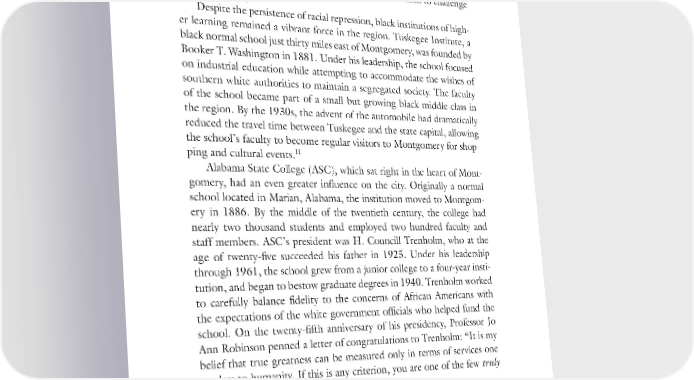 14 BECOMING KING Those rare local white leaders willing to voice concerns and challenge the racial status quo did not last long in Montgomery. African American acts of resistance seemed to be making little headway. Still, the challenges themselves demonstrate the willingness of some to take risks to challenge 10 white supremacy. Despite the persistence of racial repression, black institutions of high- er learning remained a vibrant force in the region. Tuskegee Institute, a black normal school just thirty miles east of Montgomery, was founded by Booker T. Washington in 1881. Under his leadership, the school focused on industrial education while attempting to accommodate the wishes of southern white authorities to maintain a segregated society. The faculty of the school became part of a small but growing black middle class in the region. By the 1930s, the advent of the automobile had dramatically reduced the travel time between Tuskegee and the state capital, allowing the school’s faculty to become regular visitors to Montgomery for shop- 11 ping and cultural events. Alabama State College (ASC), which sat right in the heart of Mont- gomery, had an even greater influence on the city. Originally a normal school located in Marian, Alabama, the institution moved to Montgom- ery in 1886. By the middle of the twentieth century, the college had nearly two thousand students and employed two hundred faculty and staff members. ASC’s president was H. Councill Trenholm, who at the age of twenty-five succeeded his father in 1925. Under his leadership through 1961, the school grew from a junior college to a four-year insti- tution, and began to bestow graduate degrees in 1940. Trenholm worked to carefully balance fidelity to the concerns of African Americans with the expectations of the white government officials who helped fund the school. On the twenty-fifth anniversary of his presidency, Professor Jo Ann Robinson penned a letter of congratulations to Trenholm: “It is my belief that true greatness can be measured only in terms of services one renders to humanity. If this is any criterion, you are one of the few truly 12 great and I respect and admire you for it.” Careful to avoid controversy, Trenholm earned the admiration of blacks and whites. His stewardship of ASC provided a haven for educated African American leaders in Montgomery. Many of the employees at ASC knew their jobs were tied to state government subsidies of their school.