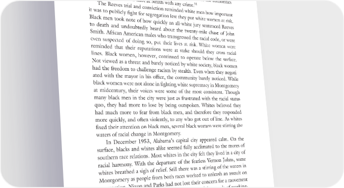 “The Stirring of the Water” 33 “the hysteria which threatened Smith is partly understandable.” In the minds of many whites in Montgomery, the threat of black males harming or even raping white women made the most unjust actions “partly under- standable.” There is no indication in the newspaper that the authorities 51 charged the man who shot at Smith with any crime. The Reeves trial and conviction reminded white men how important it was to publicly fight for segregation lest they put white women at risk. Black men took note of how quickly an all-white jury sentenced Reeves to death and undoubtedly heard about the twenty-mile chase of John Smith. African American males who transgressed the racial code, or were even suspected of doing so, put their lives at risk. White women were reminded that their reputations were at stake should they cross racial lines. Black women, however, continued to operate below the surface. Not viewed as a threat and barely noticed by white society, black women had the freedom to challenge racism by stealth. Even when they negoti- ated with the mayor in his office, the community barely noticed. While black women were not alone in fighting white supremacy in Montgomery at midcentury, their voices were some of the most consistent. Though many black men in the city were just as frustrated with the racial status quo, they had more to lose by being outspoken. Whites believed they had much more to fear from black men, and therefore they responded more quickly, and often violently, to any who got out of line. As whites fixed their attention on black men, several black women were stirring the waters of racial change in Montgomery. In December 1953, Alabama’s capital city appeared calm. On the surface, blacks and whites alike seemed fully acclimated to the mores of southern race relations. Most whites in the city felt they lived in a city of racial harmony. With the departure of the fearless Vernon Johns, some whites breathed a sigh of relief. Still there was a stirring of the waters in Montgomery as people from both races worked to unleash an assault on segregation. Nixon and Parks had not lost their concern for a movement to secure changes that would benefit the tens of thousands of working- class African Americans in and around Montgomery. Beneath the sur- face, the waters were stirring. Dexter member Thelma Rice remembered: “African-Americans in Montgomery were not as soft and idle in the late 1940s and early 1950s as the public has been led to believe. Years before