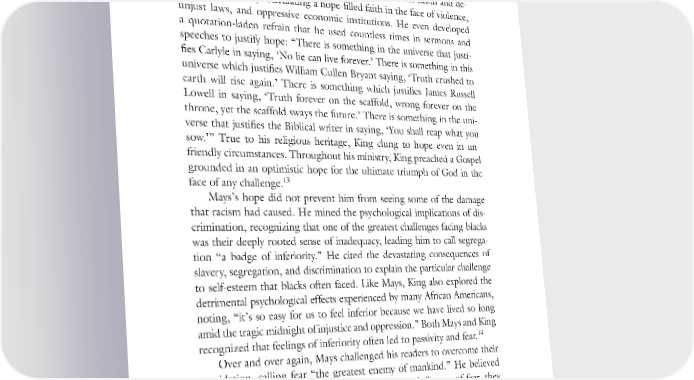 42 BECOMING KING such hope in the face of overwhelming oppression since the early days of slavery. The theme was not new, but Mays articulated this hope in edu- cated language, something King would adopt for himself. In numerous school papers and sermons, King emphasized the ultimate death and de- struction of evil by articulating a hope-filled faith in the face of violence, unjust laws, and oppressive economic institutions. He even developed a quotation-laden refrain that he used countless times in sermons and speeches to justify hope: “There is something in the universe that justi- fies Carlyle in saying, ‘No lie can live forever.’ There is something in this universe which justifies William Cullen Bryant saying, ‘Truth crushed to earth will rise again.’ There is something which justifies James Russell Lowell in saying, ‘Truth forever on the scaffold, wrong forever on the throne, yet the scaffold sways the future.’ There is something in the uni- verse that justifies the Biblical writer in saying, ‘You shall reap what you sow.’” True to his religious heritage, King clung to hope even in un- friendly circumstances. Throughout his ministry, King preached a Gospel grounded in an optimistic hope for the ultimate triumph of God in the 13 face of any challenge. Mays’s hope did not prevent him from seeing some of the damage that racism had caused. He mined the psychological implications of dis- crimination, recognizing that one of the greatest challenges facing blacks was their deeply rooted sense of inadequacy, leading him to call segrega- tion “a badge of inferiority.” He cited the devastating consequences of slavery, segregation, and discrimination to explain the particular challenge to self-esteem that blacks often faced. Like Mays, King also explored the detrimental psychological effects experienced by many African Americans, noting, “it’s so easy for us to feel inferior because we have lived so long amid the tragic midnight of injustice and oppression.” Both Mays and King 14 recognized that feelings of inferiority often led to passivity and fear. Over and over again, Mays challenged his readers to overcome their trepidation, calling fear “the greatest enemy of mankind.” He believed that as long as black southerners were under the influence of fear, they would lack the necessary boldness and resolve to sustain a movement for change. When fear rules, progress becomes stunted, justice is deferred, and equality proves evasive. The courage that is so essential to significant social advancement can easily fall prey to crippling cowardice. King took