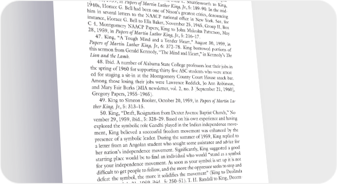 Notes to Pages 172–175 225 45. MIA newsletter, vol. 1, no. 12 (April 30, 1959), Montgomery Im- provement Association Collection; Montgomery Advertiser, March 21, 1959. 46. Session of Trinity Presbyterian Church to Mrs. Arnold Smith, April 13, 1959, Folder 1, Andrews Collection; Fred L. Shuttlesworth to King, April 24, 1959, in Papers of Martin Luther King, Jr., 5: 189–90. In the mid- 1940s, Horace G. Bell had been one of Nixon’s greatest critics, denouncing him in several letters to the NAACP national office in New York. See, for instance, Horace G. Bell to Ella Baker, November 25, 1945, Group II, Box C-4, Montgomery NAACP Papers; King to John Malcolm Patterson, May 28, 1959, in Papers of Martin Luther King, Jr., 5: 216–17. 47. King, “A Tough Mind and a Tender Heart,” August 30, 1959, in Papers of Martin Luther King, Jr., 6: 372–78. King borrowed portions of this sermon from Gerald Kennedy, “The Mind and Heart,” in Kennedy’s The Lion and the Lamb. 48. Ibid. A number of Alabama State College professors lost their jobs in the spring of 1960 for supporting thirty-five ASC students who were arrest- ed for staging a sit-in at the Montgomery County Court House snack bar. Among those losing their jobs were Lawrence Reddick, Jo Ann Robinson, and Mary Fair Burks (MIA newsletter, vol. 2, no. 3 [September 21, 1960], Gregory Papers, 1955–1965). 49. King to Simeon Booker, October 20, 1959, in Papers of Martin Lu- ther King, Jr., 5: 313–15. 50. King, “Draft, Resignation from Dexter Avenue Baptist Church,” No- vember 29, 1959, ibid., 5: 328–29. Based on his own experience and having explored the symbolic role Gandhi played in the Indian independence move- ment, King believed a successful freedom movement was enhanced by the presence of a symbolic leader. During the summer of 1959, King replied to a letter from an Angolan student who sought some assistance and advice for her nation’s independence movement. Significantly, King suggested a good starting place would be to find an individual who would “stand as a symbol for your independence movement. As soon as your symbol is set up it is not difficult to get people to follow, and the more the oppressor seeks to stop and defeat the symbol, the more it solidifies the movement” (King to Deolinda Rodrigues, July 21, 1959, ibid., 5: 250–51). T. H. Randall to King, Decem- ber 1, 1959, ibid., 5: 332. 51. King, “Address at the Fourth Annual Institute on Nonviolence and Social Change,” December 3, 1959, ibid., 5: 333–43. 52. King to the Montgomery County Board of Education, August 28, 1959, ibid., 5: 270–72.