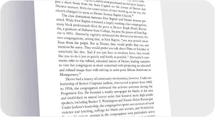 24 BECOMING KING Church. While the exact reasons for the church split are sketchy, later explanations emphasize the role of class, suggesting that those departing Columbus Street Baptist objected to the congregation’s emotive styles of worship and the muddy entrance to the building following heavy rains. The Second Colored Baptist Church soon purchased an old slave-trader’s pen a short block from the State Capitol on the corner of Dexter and Decatur avenues. With the construction of their building on the site, the 31 church changed its name to Dexter Avenue Baptist Church. The class distinctions between First Baptist and Dexter Avenue per- sisted. While First Baptist remained a largely working-class congregation, many black professionals filled the pews at Dexter. Ralph David Aberna- thy, a graduate of Alabama State College, became the pastor of First Bap- tist in 1951. Abernathy regularly delineated the distinctions between the two congregations, noting that, at First Baptist, “you may preach about Jesus from the pulpit. But at Dexter, they would prefer that you not mention his name. They would prefer you talk about Plato or Socrates or somebody like that. And if you just have to mention Jesus, they would like you to do it just as quietly and briefly as possible.” Abernathy’s com- ments refer to the refined, educated nature of Dexter, leading outsiders to view her congregants as more concerned with projecting an educated and refined image than with striving to assist poor African Americans in 32 Montgomery. Dexter had a history of community involvement, however. Under the leadership of Robert Chapman Judkins, who served as pastor from 1905 to 1916, the congregation embraced the activism common during the Progressive Era. He founded a weekly newspaper for blacks in the area and established an annual lecture series that featured many high-profile speakers, including Booker T. Washington and Nannie Helen Burroughs. Under Judkins’s leadership, the congregation spoke out on issues of racial violence and lynching, suffrage for blacks and women, and Prohibition. During his tenure, women in the congregation were particularly active through the women’s missionary society, which urged women to pursue racial uplift through accommodationist strategies while also addressing significant health, education, and suffrage issues that affected all of Mont- gomery’s African American citizens. Challenged by two world wars, the Great Depression, a financial crunch, and some poor choices of pastors,
