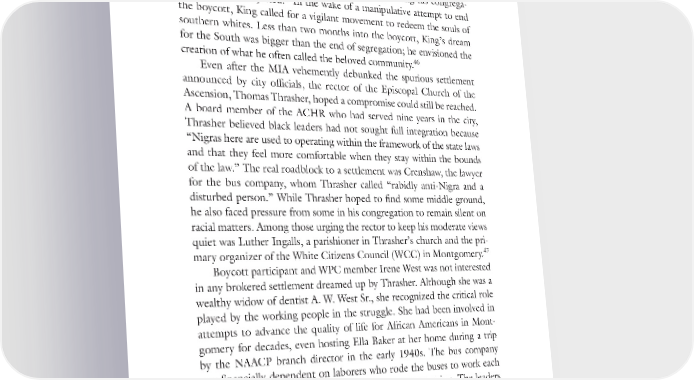 108 BECOMING KING while they continued to trample “over the Negro” in the United States. King’s proposed method for reaching out to southern whites included exploring “the root of the problem,” loving them, and sitting down and preaching to them. He concluded the sermon by calling his congrega- tion to “be maladjusted.” In the wake of a manipulative attempt to end the boycott, King called for a vigilant movement to redeem the souls of southern whites. Less than two months into the boycott, King’s dream for the South was bigger than the end of segregation; he envisioned the 46 creation of what he often called the beloved community. Even after the MIA vehemently debunked the spurious settlement announced by city officials, the rector of the Episcopal Church of the Ascension, Thomas Thrasher, hoped a compromise could still be reached. A board member of the ACHR who had served nine years in the city, Thrasher believed black leaders had not sought full integration because “Nigras here are used to operating within the framework of the state laws and that they feel more comfortable when they stay within the bounds of the law.” The real roadblock to a settlement was Crenshaw, the lawyer for the bus company, whom Thrasher called “rabidly anti-Nigra and a disturbed person.” While Thrasher hoped to find some middle ground, he also faced pressure from some in his congregation to remain silent on racial matters. Among those urging the rector to keep his moderate views quiet was Luther Ingalls, a parishioner in Thrasher’s church and the pri- 47 mary organizer of the White Citizens Council (WCC) in Montgomery. Boycott participant and WPC member Irene West was not interested in any brokered settlement dreamed up by Thrasher. Although she was a wealthy widow of dentist A. W. West Sr., she recognized the critical role played by the working people in the struggle. She had been involved in attempts to advance the quality of life for African Americans in Mont- gomery for decades, even hosting Ella Baker at her home during a trip by the NAACP branch director in the early 1940s. The bus company was financially dependent on laborers who rode the buses to work each day. These were “the ones who keep this movement going. The leaders could do nothing by themselves. They are only the voice of thousands of colored workers.” West believed a significant change had occurred in white-black relations since the Brown decision, as white clerks in the town’s stores began interacting with African American patrons with “a