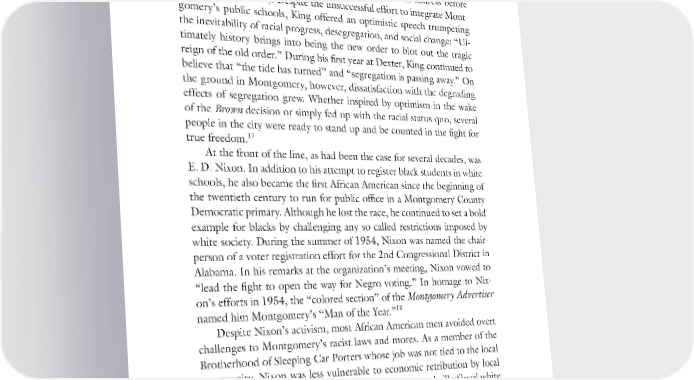 62 BECOMING KING enduring faith in the transforming and redemptive possibilities of love 16 proved to be an unwavering conviction of his public ministry. A few days after moving to Montgomery, King attended the National Baptist Convention in St. Louis, where he delivered an address before the women’s auxiliary. Despite the unsuccessful effort to integrate Mont- gomery’s public schools, King offered an optimistic speech trumpeting the inevitability of racial progress, desegregation, and social change: “Ul- timately history brings into being the new order to blot out the tragic reign of the old order.” During his first year at Dexter, King continued to believe that “the tide has turned” and “segregation is passing away.” On the ground in Montgomery, however, dissatisfaction with the degrading effects of segregation grew. Whether inspired by optimism in the wake of the Brown decision or simply fed up with the racial status quo, several people in the city were ready to stand up and be counted in the fight for 17 true freedom. At the front of the line, as had been the case for several decades, was E. D. Nixon. In addition to his attempt to register black students in white schools, he also became the first African American since the beginning of the twentieth century to run for public office in a Montgomery County Democratic primary. Although he lost the race, he continued to set a bold example for blacks by challenging any so-called restrictions imposed by white society. During the summer of 1954, Nixon was named the chair- person of a voter registration effort for the 2nd Congressional District in Alabama. In his remarks at the organization’s meeting, Nixon vowed to “lead the fight to open the way for Negro voting.” In homage to Nix- on’s efforts in 1954, the “colored section” of the Montgomery Advertiser 18 named him Montgomery’s “Man of the Year.” Despite Nixon’s activism, most African American men avoided overt challenges to Montgomery’s racist laws and mores. As a member of the Brotherhood of Sleeping Car Porters whose job was not tied to the local community, Nixon was less vulnerable to economic retribution by local whites. Those whose service jobs depended on the goodwill of local white businessmen could not afford to share Nixon’s boldness. According to Jo Ann Robinson, many black men stopped riding the city buses during this period, fearing the abuse and humiliation they so often received from bus drivers. They also were tired of feeling powerless while drivers disrespect-