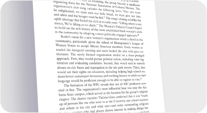 28 BECOMING KING founded in 1888 to support racial uplift and philanthropy. Anna Duncan established another prominent black women’s club in 1897. The Twenti- eth Century Club, which was later renamed the Anna M. Duncan Club, focused on supporting African American culture and engaging in philan- thropic efforts. Soon after its founding, the group became a significant organizing force for the National Association of Colored Women. The organization’s club song includes the following lyrics: “Our race must be enlightened, we must earn our daily bread, we must give our time and talent and the hungry must be fed.” The song’s closing solidifies the uplift ideology that fueled the club in its early years: “Lifting others is our motto, We’re lifting as we climb.” The Women’s Political Council hoped to build on the rich history of the more established black women’s clubs 40 in the community by adopting a more politically engaged approach. Burks’s vision for a new women’s organization struck a chord in the community, particularly given the refusal of Montgomery’s League of Women Voters to accept African American members. Forty women at- tended the inaugural meeting and most backed the idea with great en- thusiasm. The newly formed organization settled on a three-pronged approach. First, they would pursue political action, including voter reg- istration and evaluating candidates. Second, they would seek to remedy abuses on city buses and segregation in the city park system. Third, they would set their sights on education, including helping high school stu- dents better understand democracy and teaching literacy to adults so their 41 language would be proficient enough to be able to register to vote. The formation of the WPC reveals that not all ASC professors cow- ered in fear. The organization’s most influential base was near the Ala- bama State campus, which served as the location for the group’s original chapter. The charter member Thelma Glass confirmed that it was “made up of persons like me who were in at the University and school teachers and others in the city and what not—and some outstanding religious leaders—women who had always shown interest in making things bet- ter.” Another early member was Mrs. Irene West, who was a graduate of Alabama State Normal School and the widow of a dentist. One of the older women involved in the organization, West brought them instant credibility with many in the city’s African American community. Local pastor Solomon Seay described West as “a fearless woman who was in-